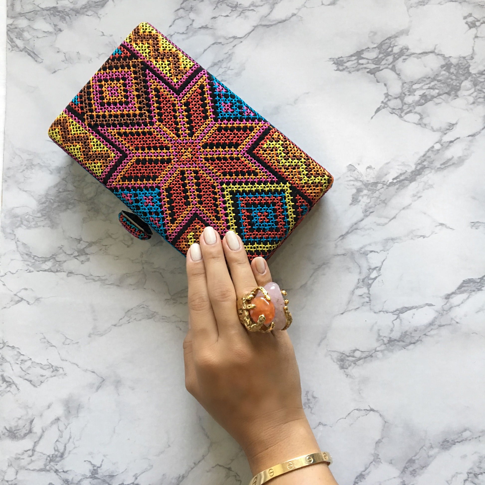 Handmade clutch bags with exquisite fabric coverings. Carry it in the palm of your hand or sling it over your shoulder with the included cross body chain.