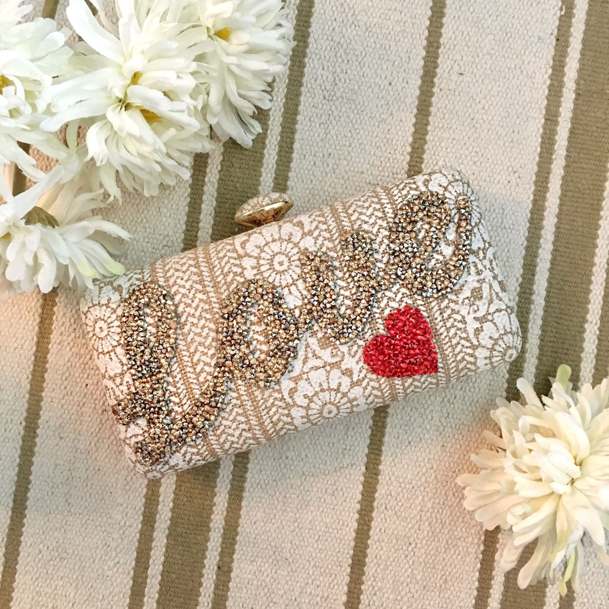 Handmade clutch bags with exquisite fabric coverings. Carry it in the palm of your hand or sling it over your shoulder with the included cross body chain.