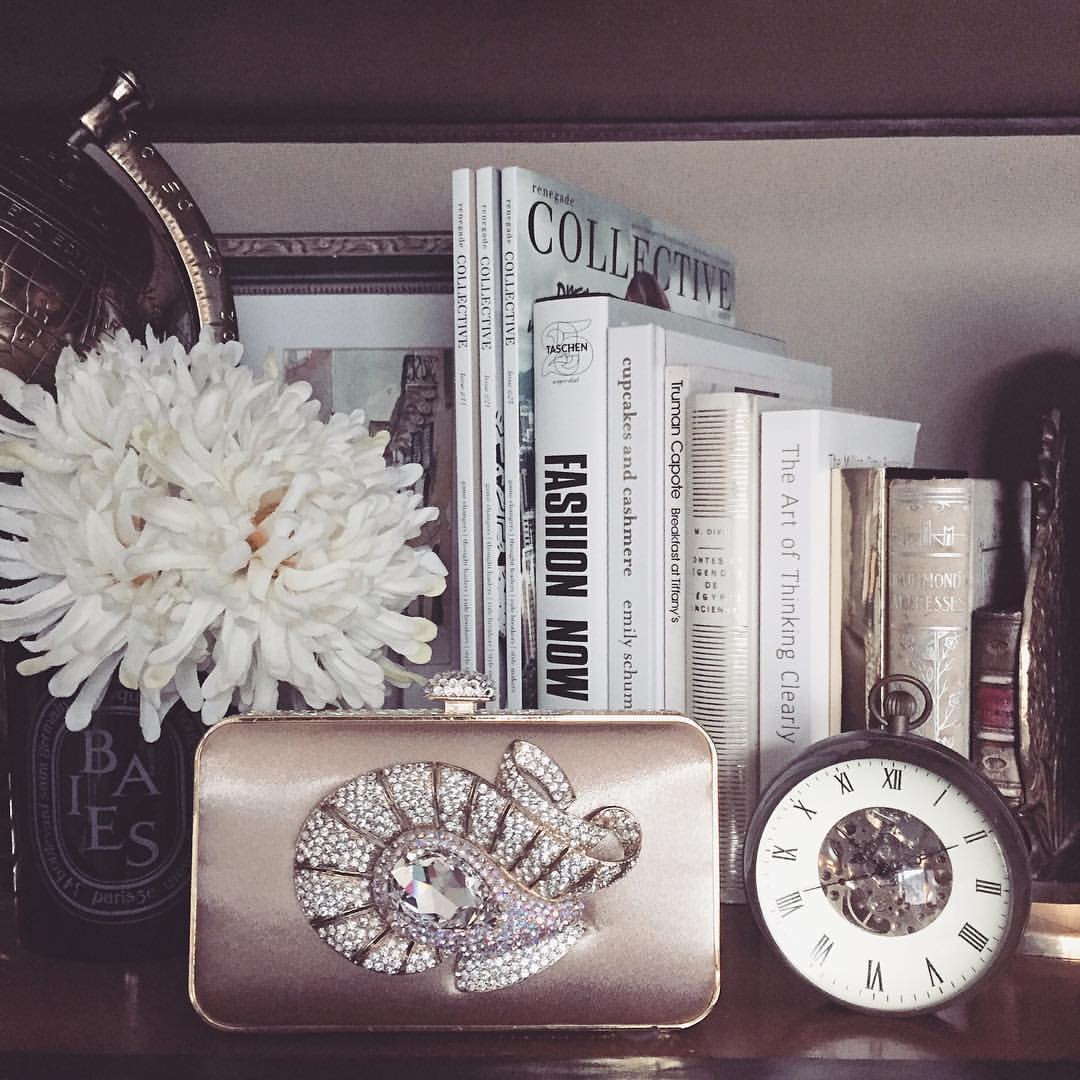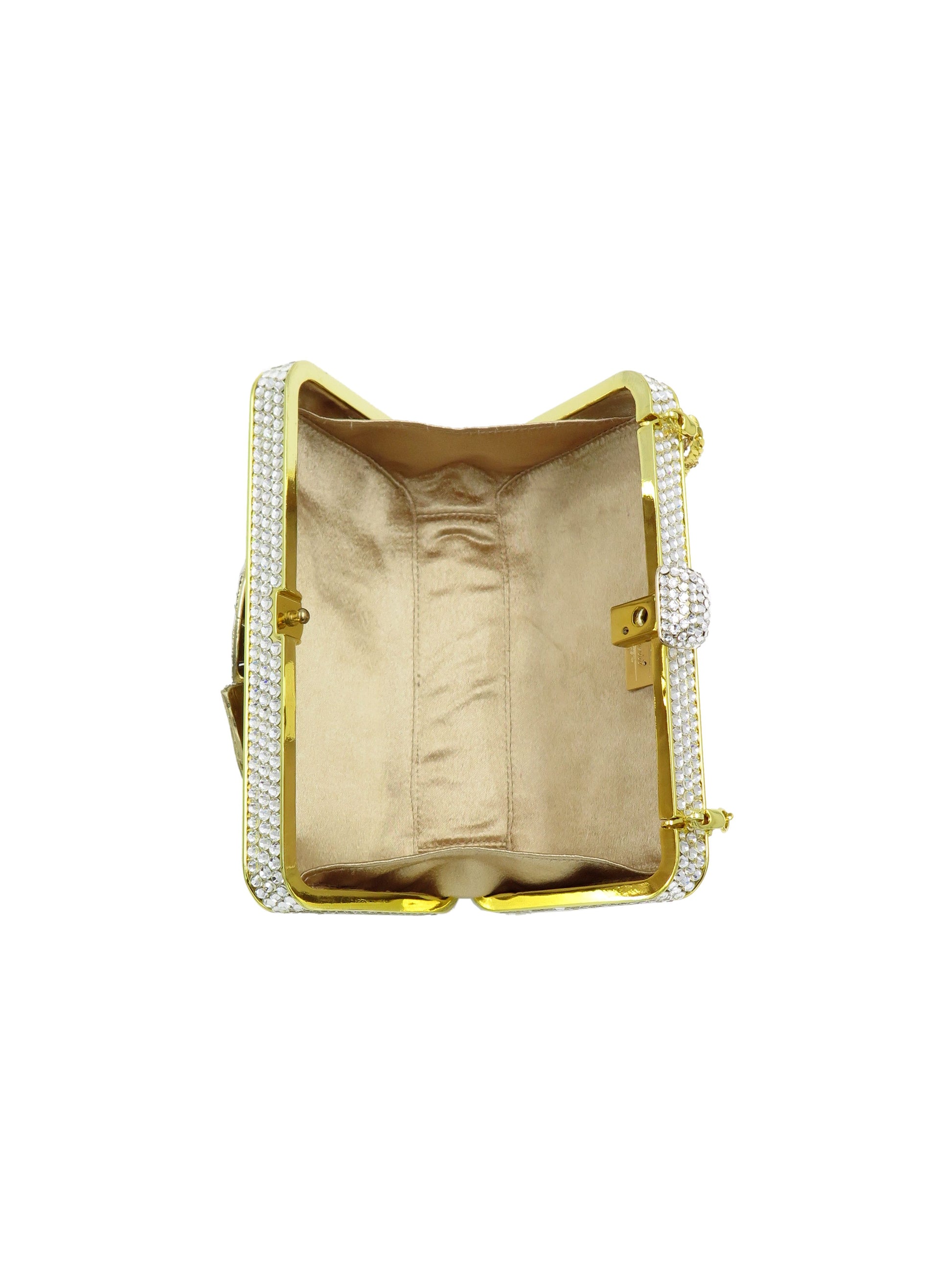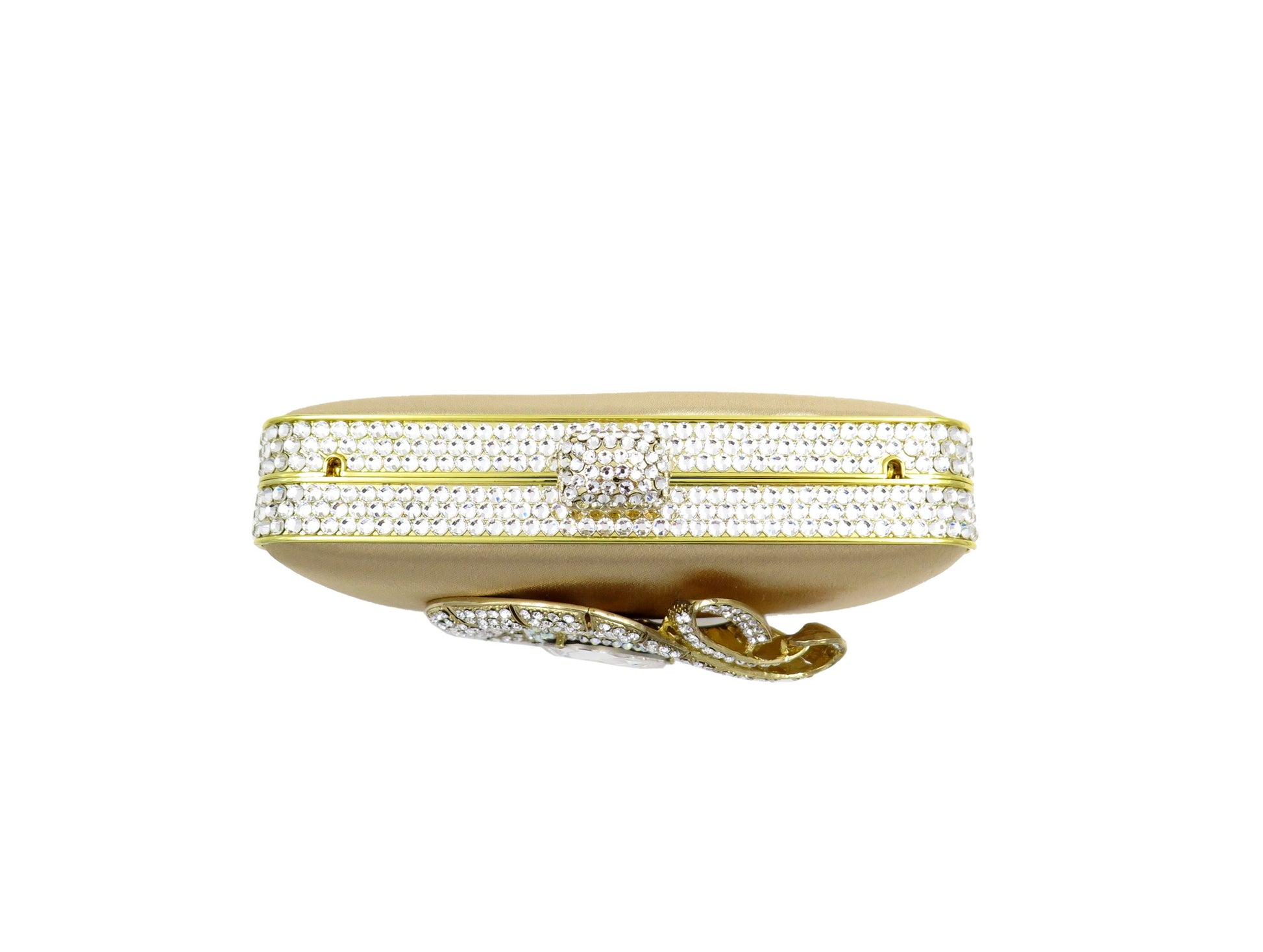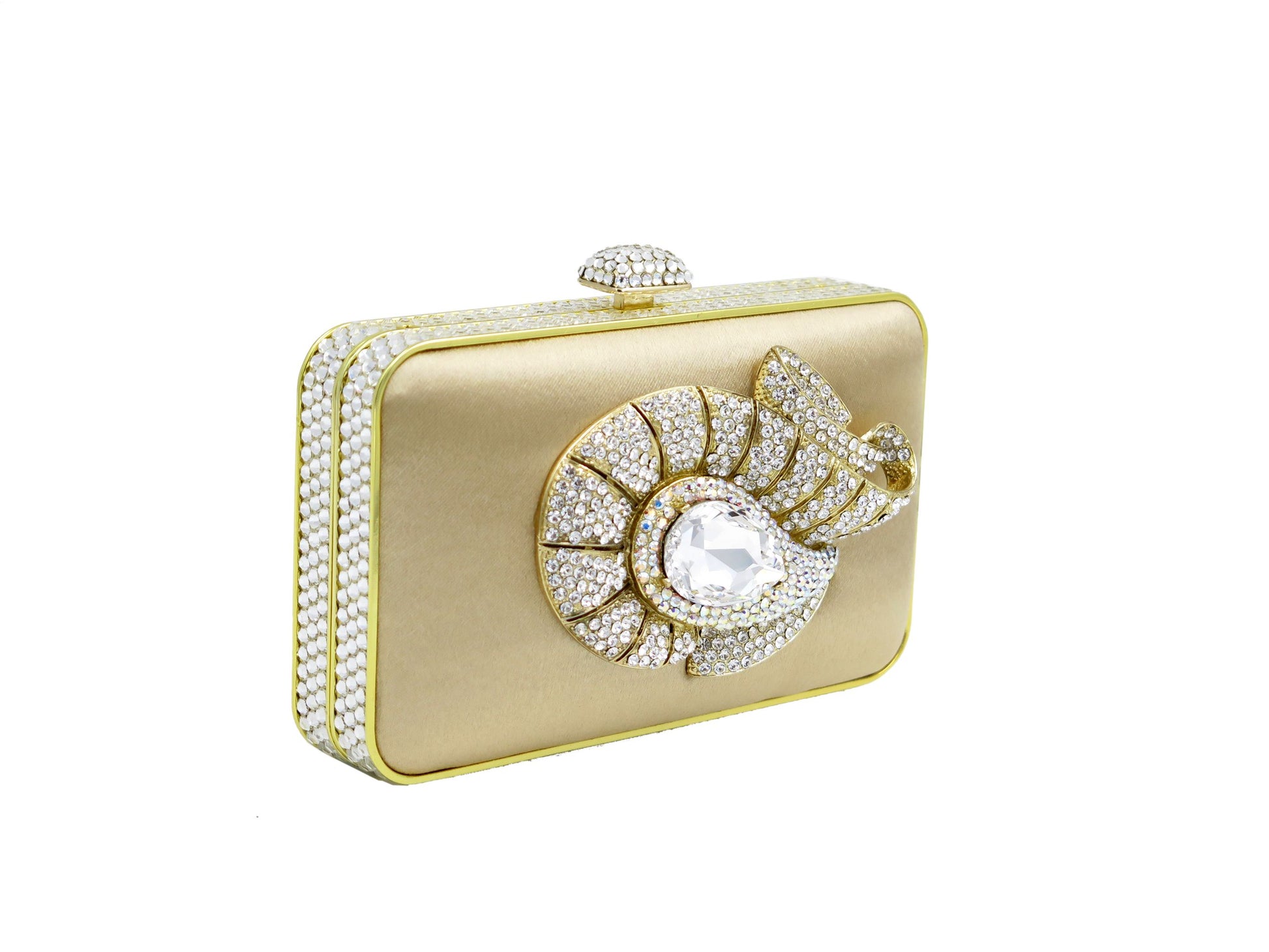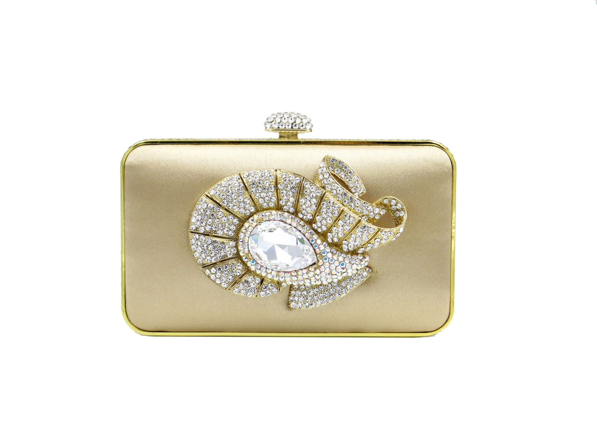 Clutch bags with unique brooch designs on the front panel. Carry it in the palm of your hand or sling it over your shoulder with the included cross body chain.