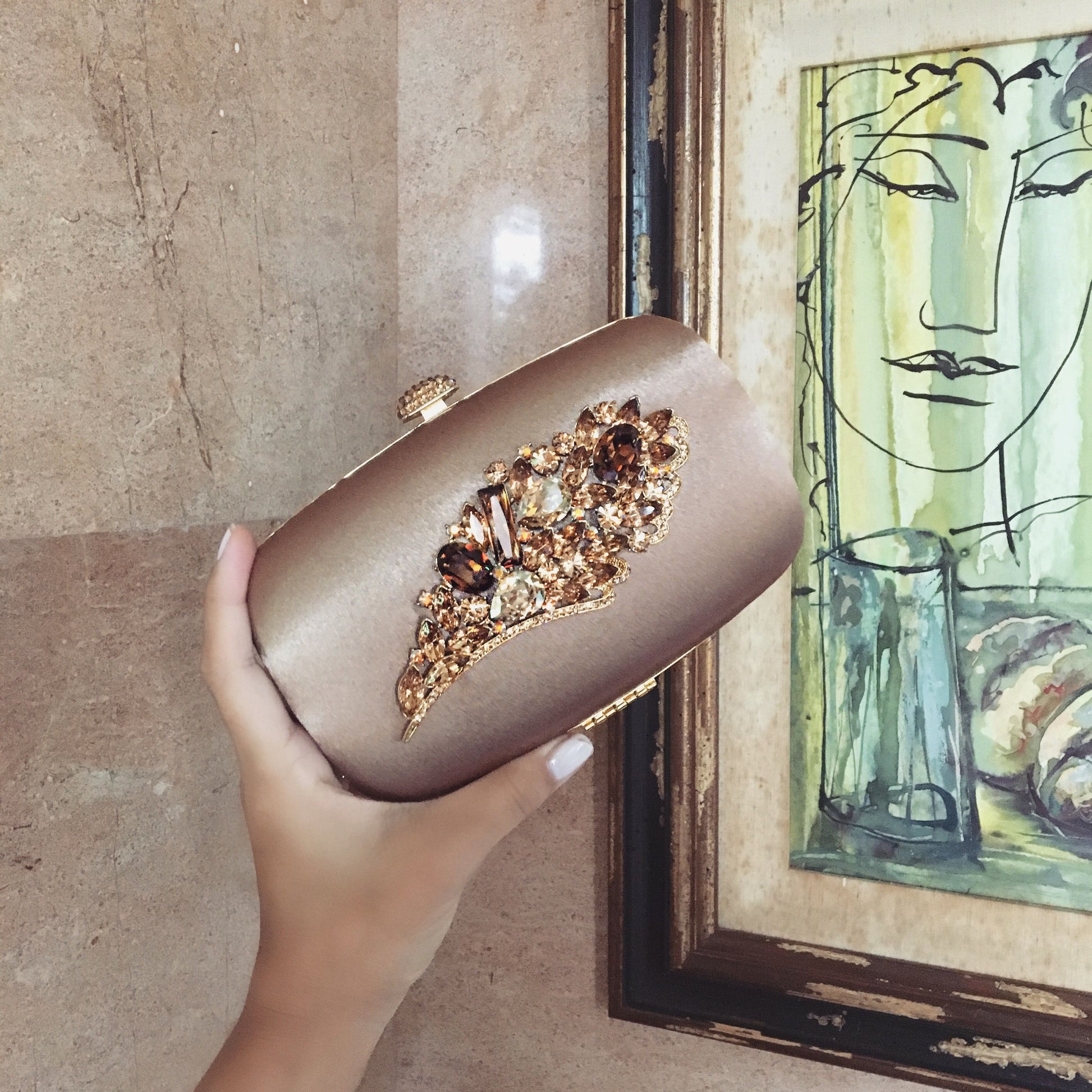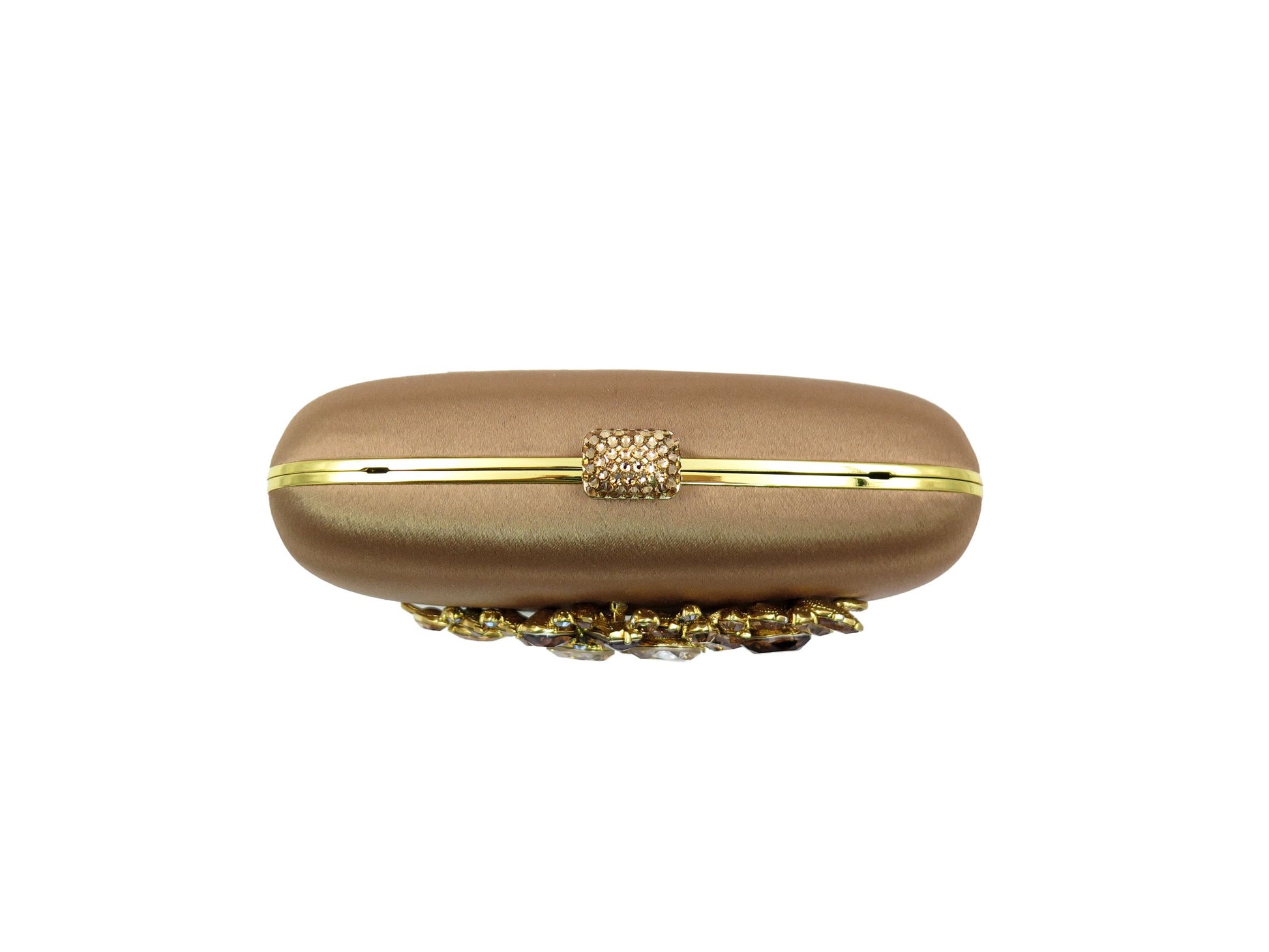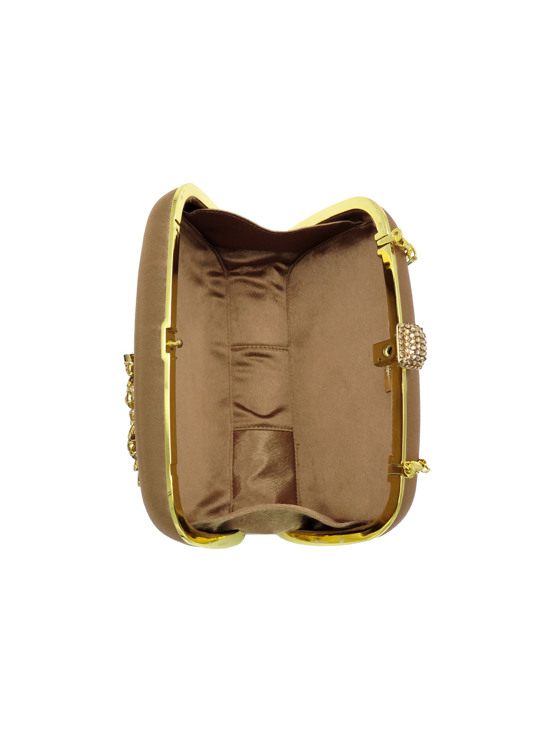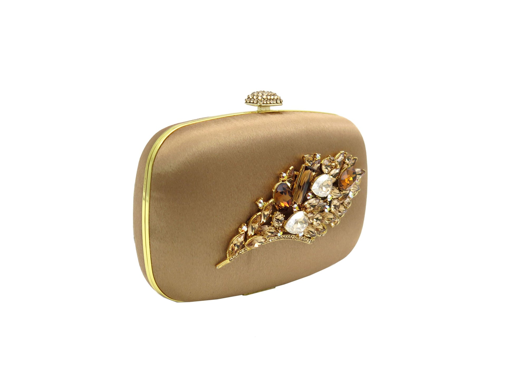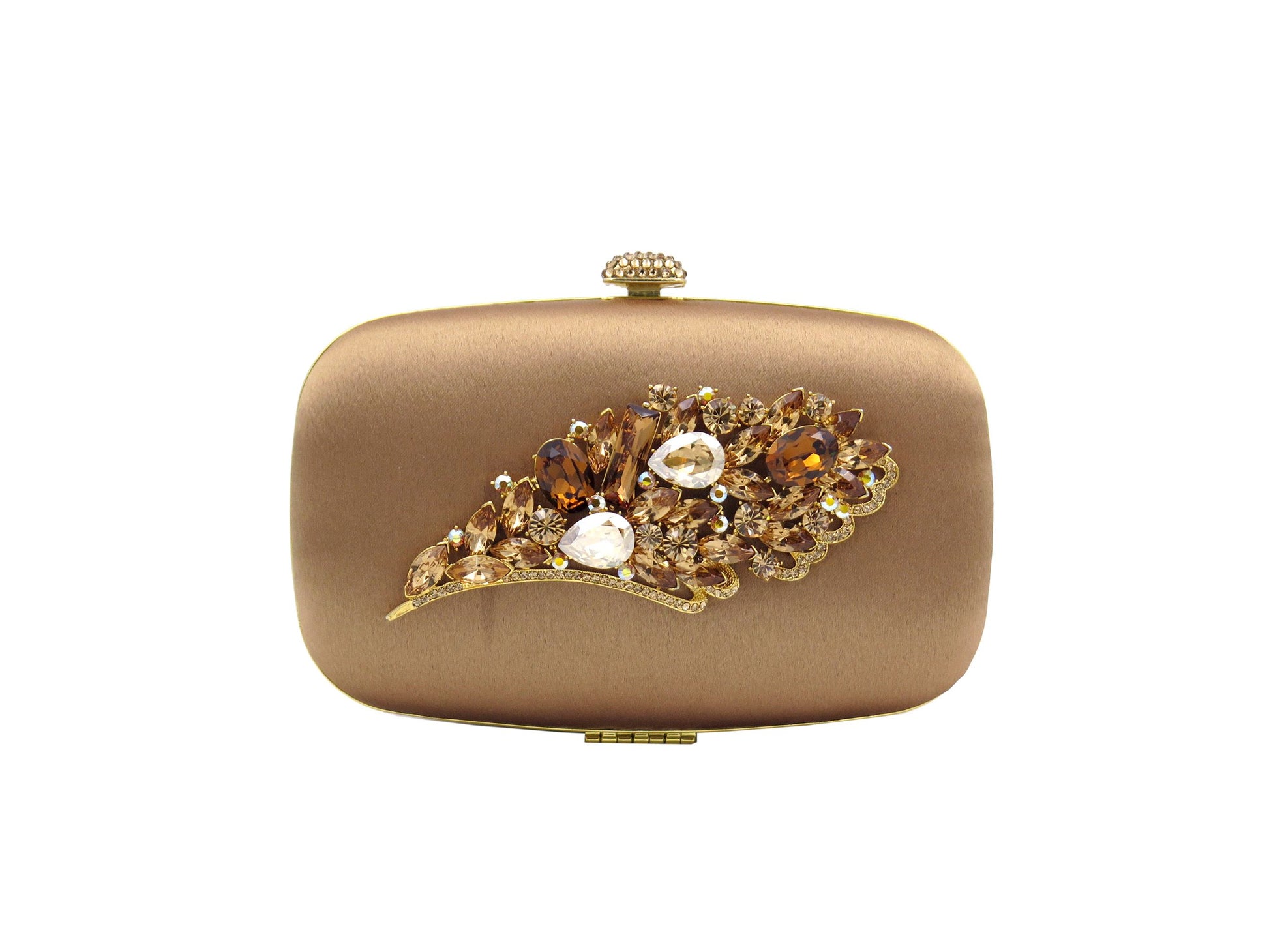 Clutch bags with unique brooch designs on the front panel. Carry it in the palm of your hand or sling it over your shoulder with the included cross body chain.