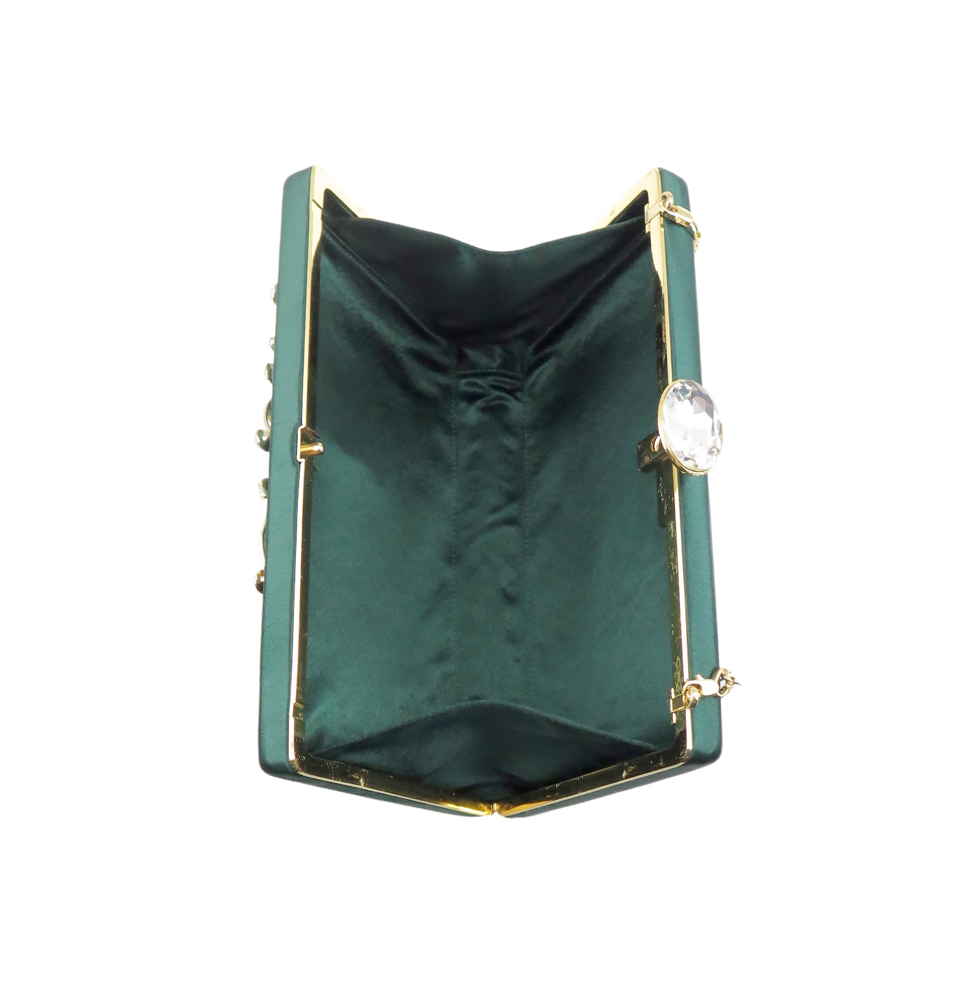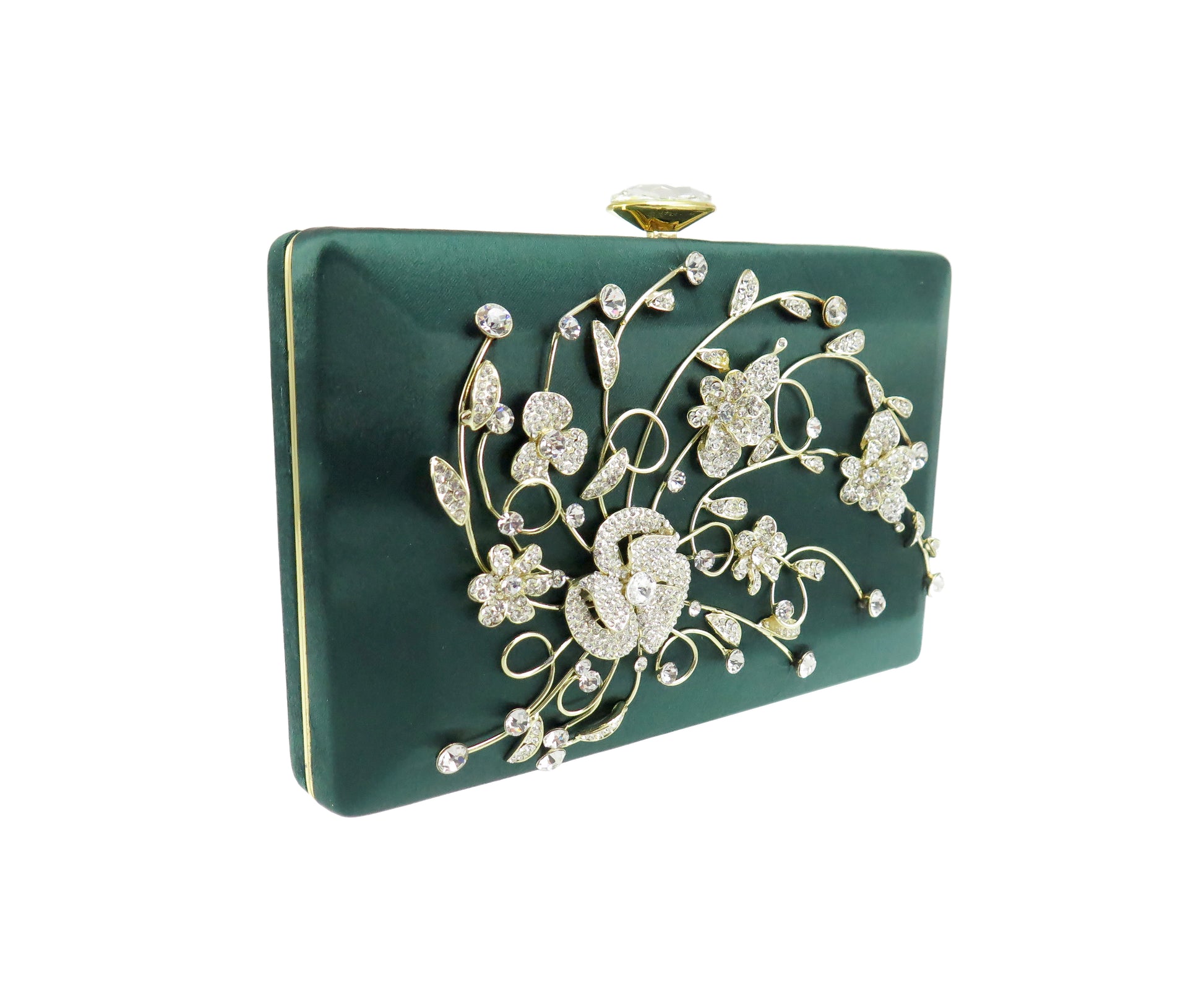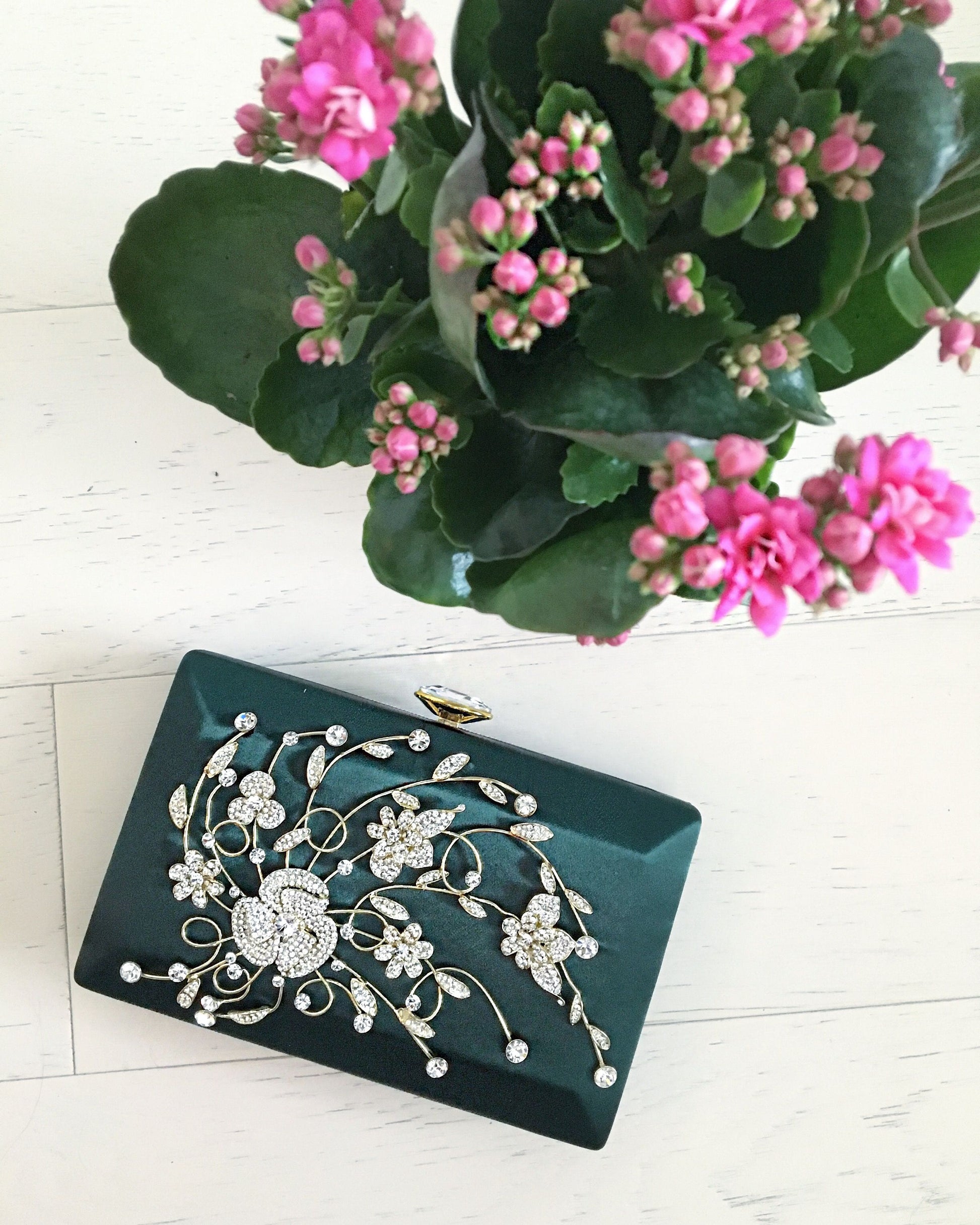 Clutch bags with unique brooch designs on the front panel. Carry it in the palm of your hand or sling it over your shoulder with the included cross body chain.
