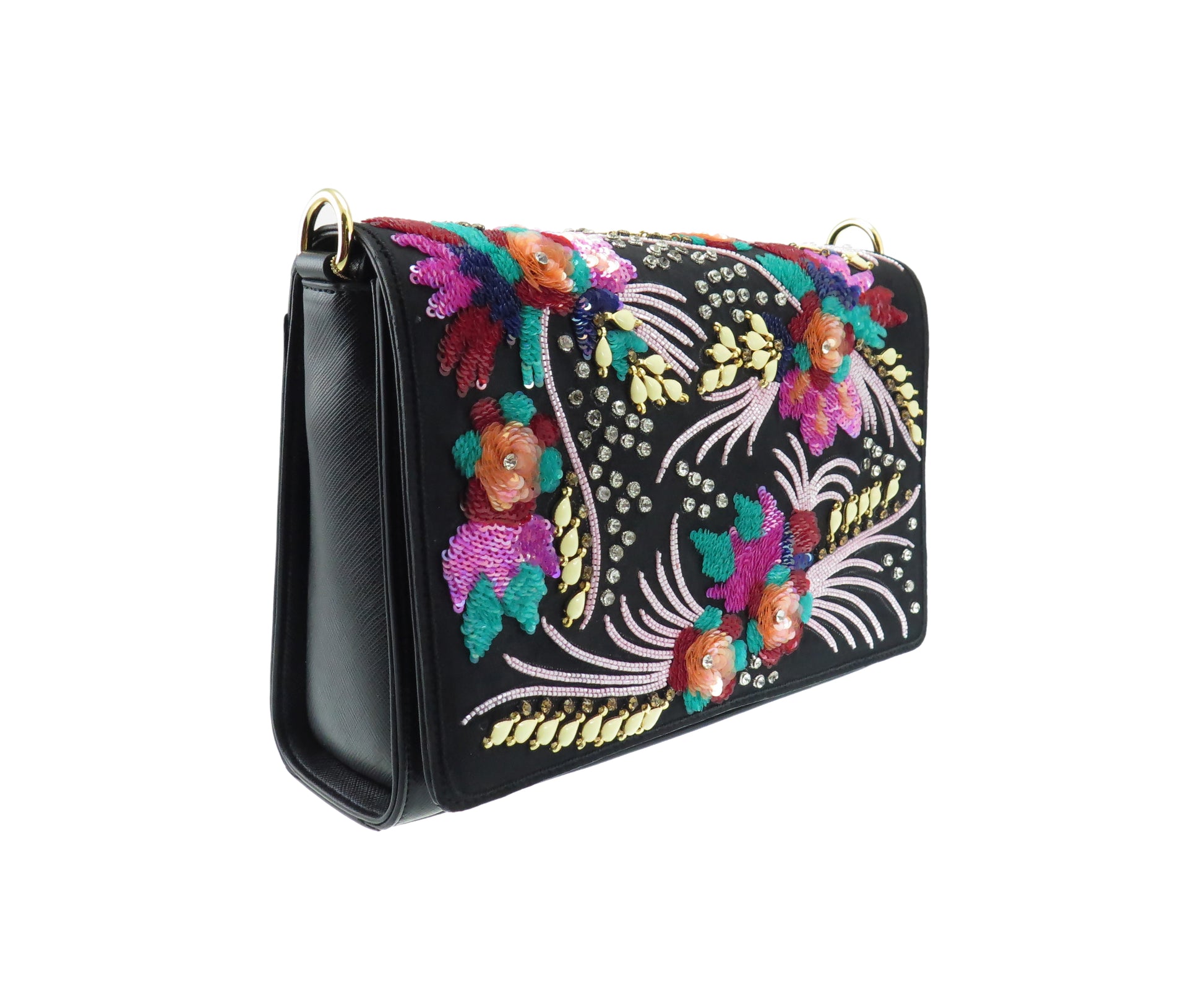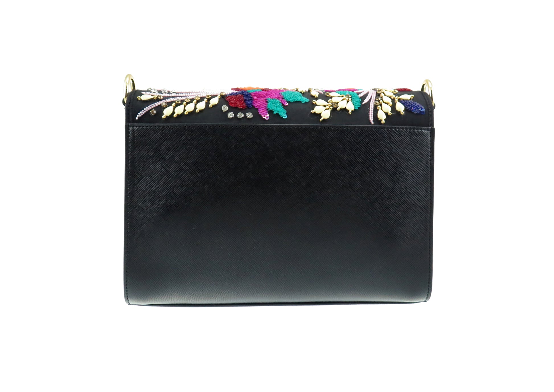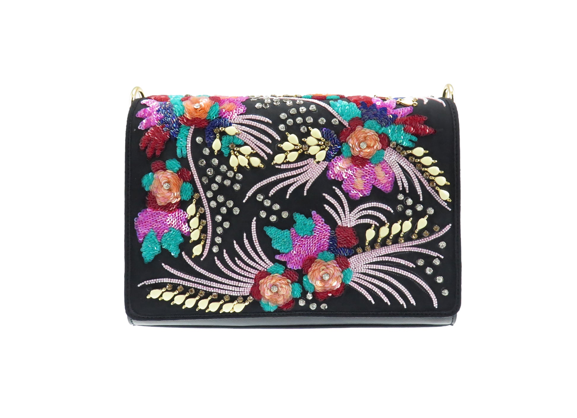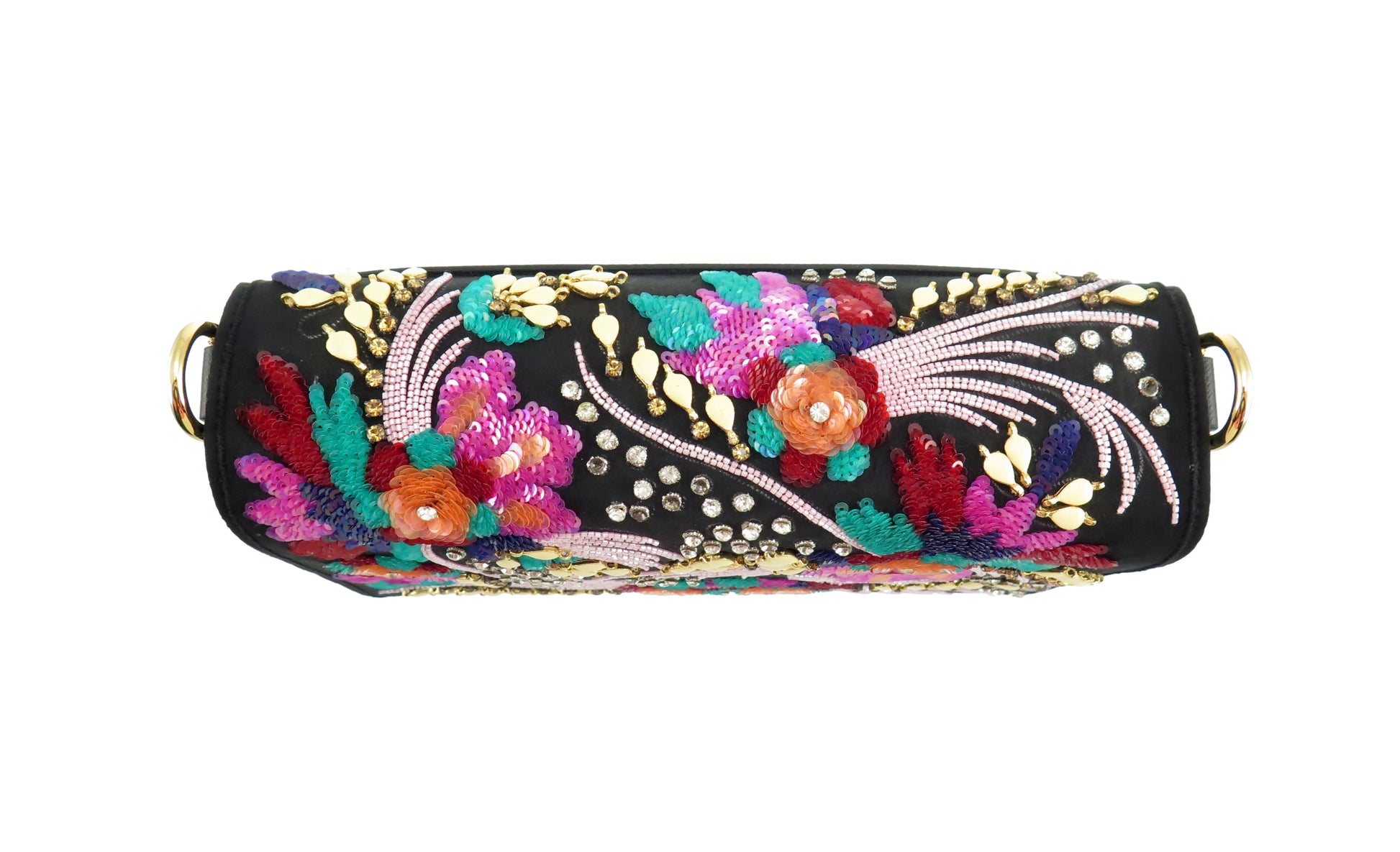 Clutch bags with hand embroidered work formed into delicate tracery.