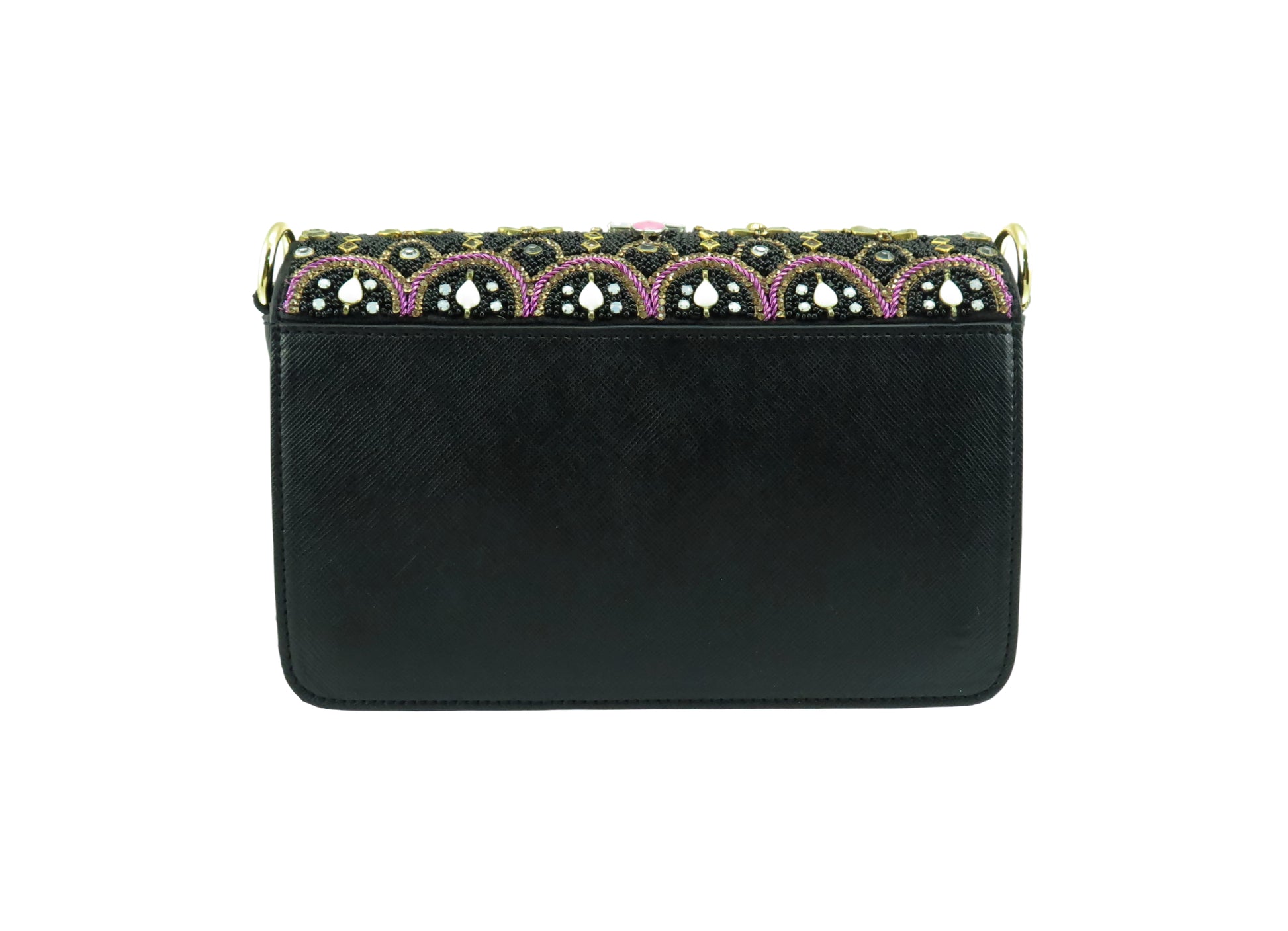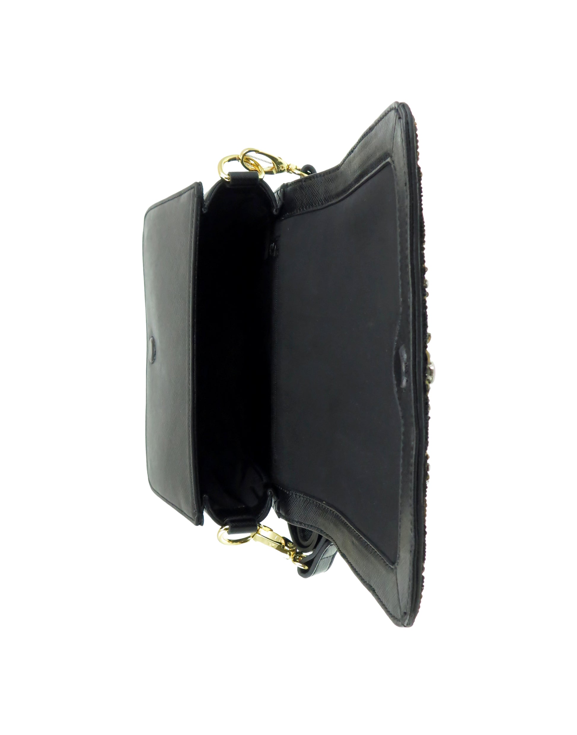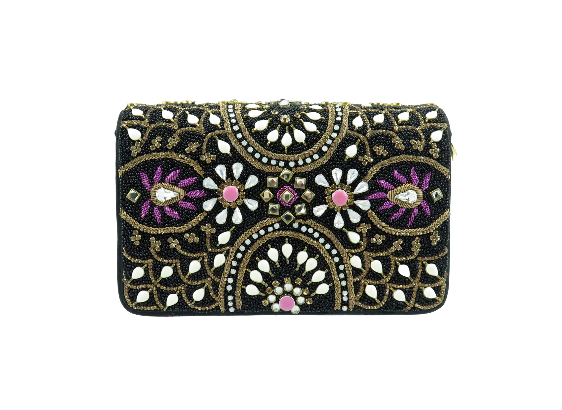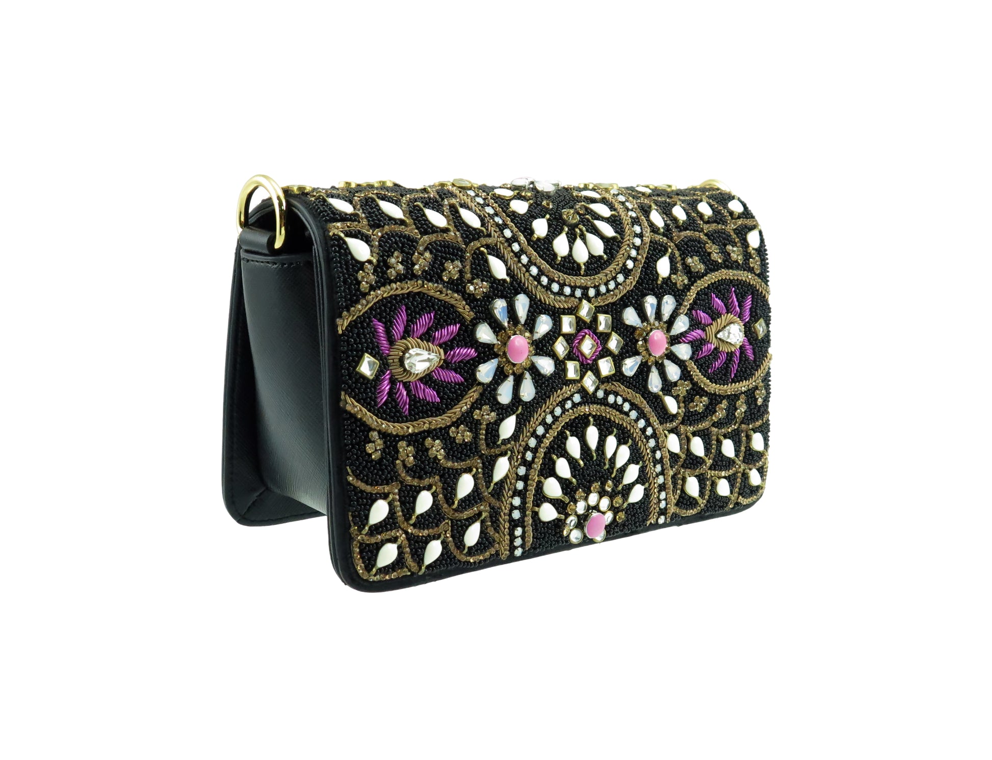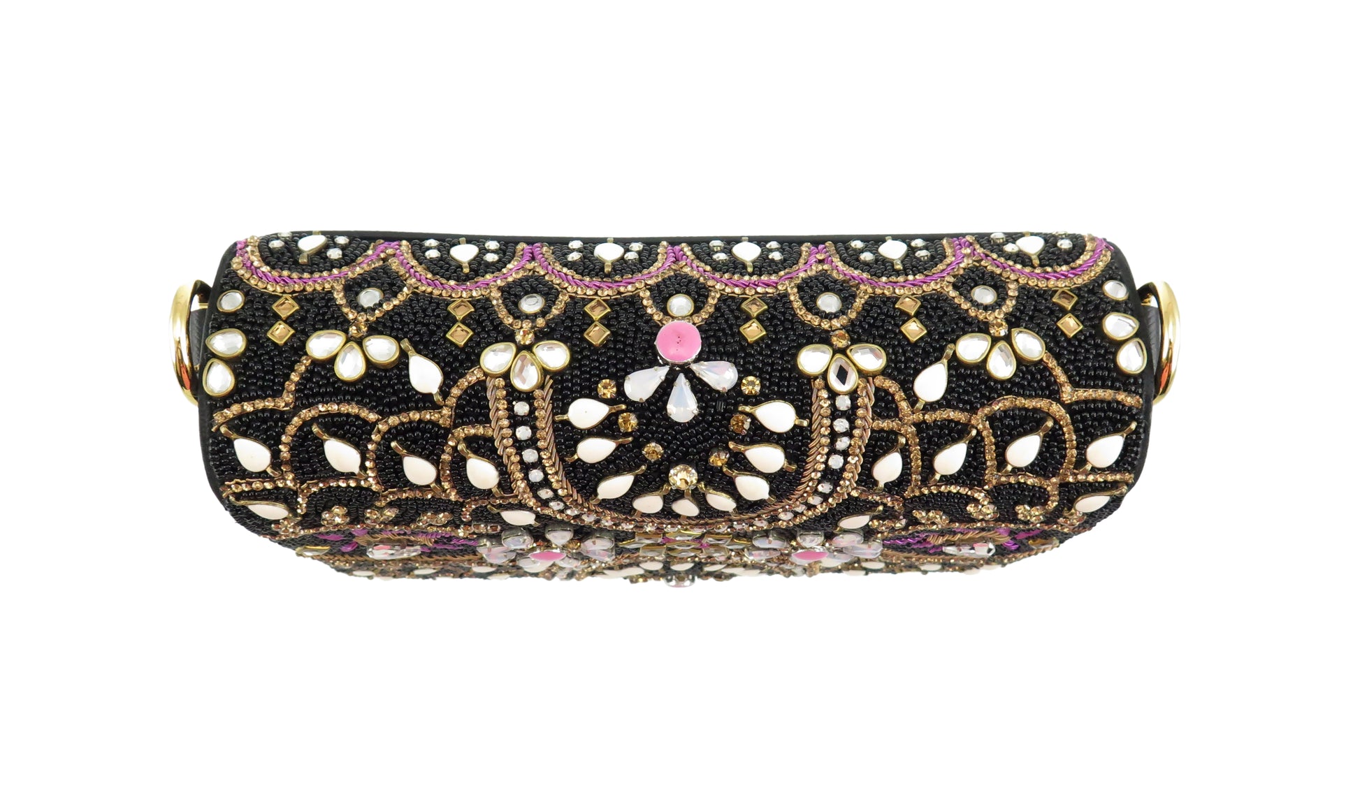 Clutch bags with hand embroidered work formed into delicate tracery.