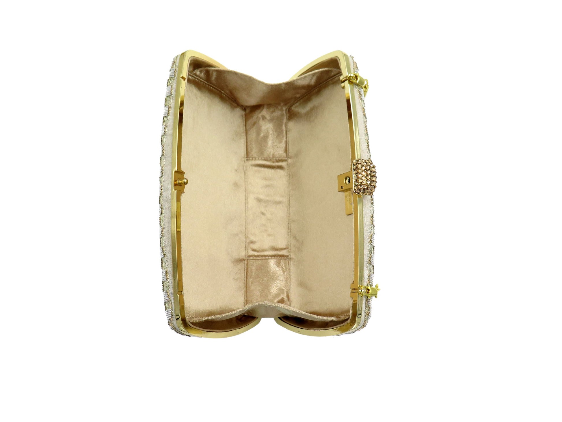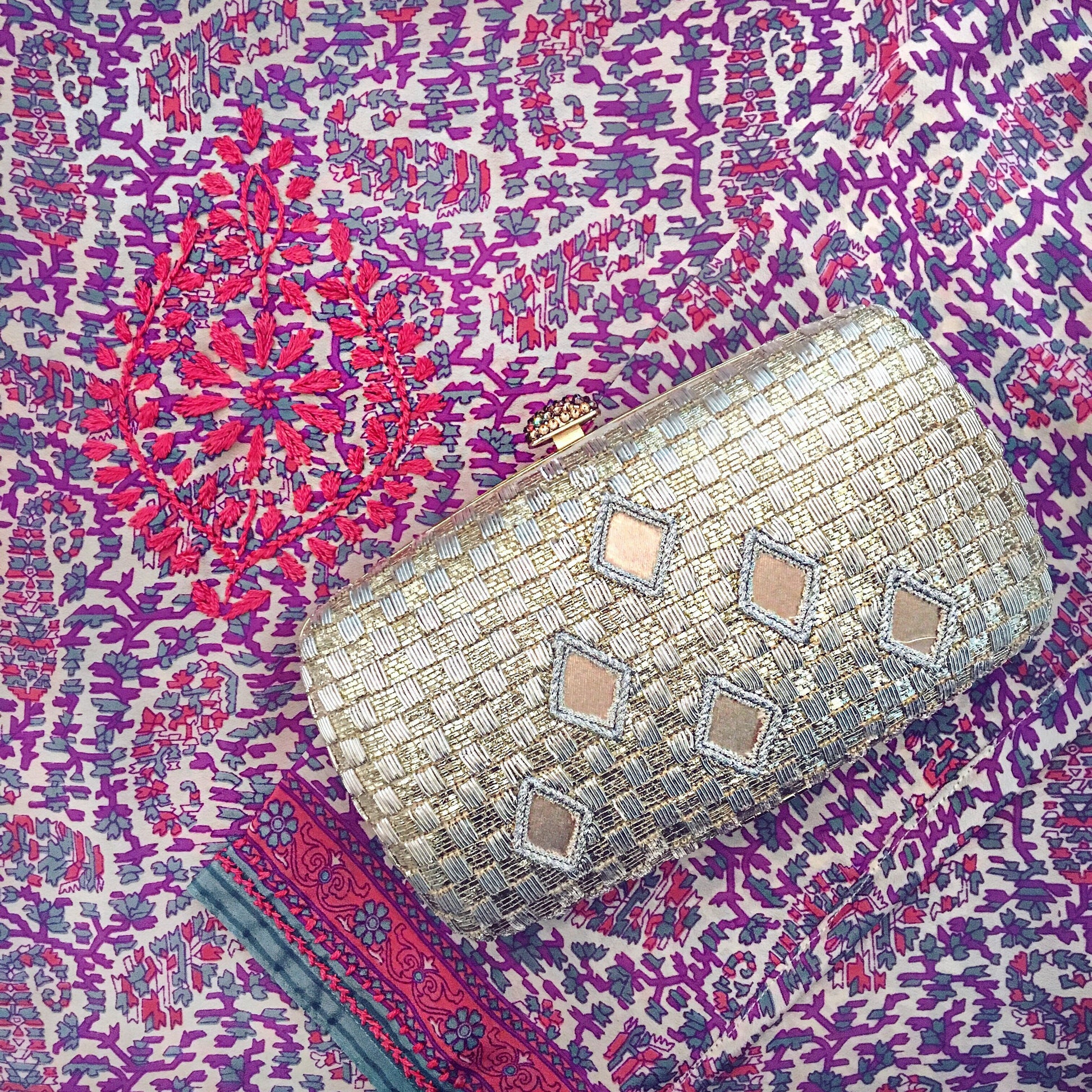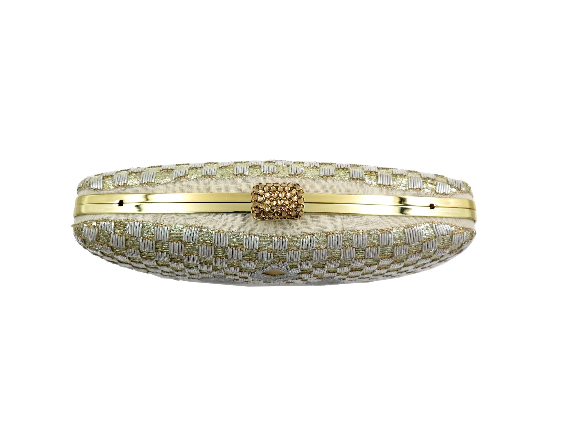 Clutch bags with hand embroidered work formed into delicate tracery.