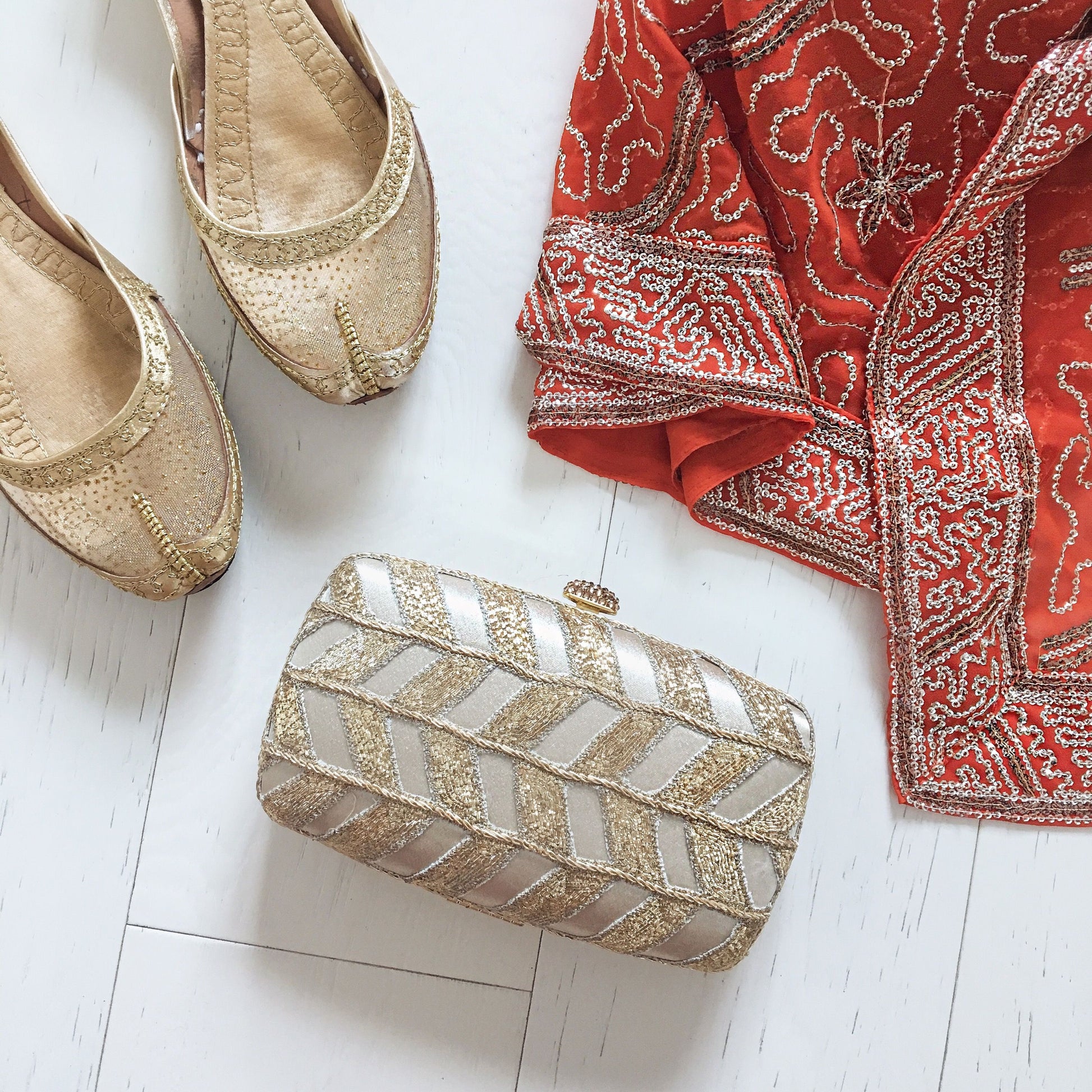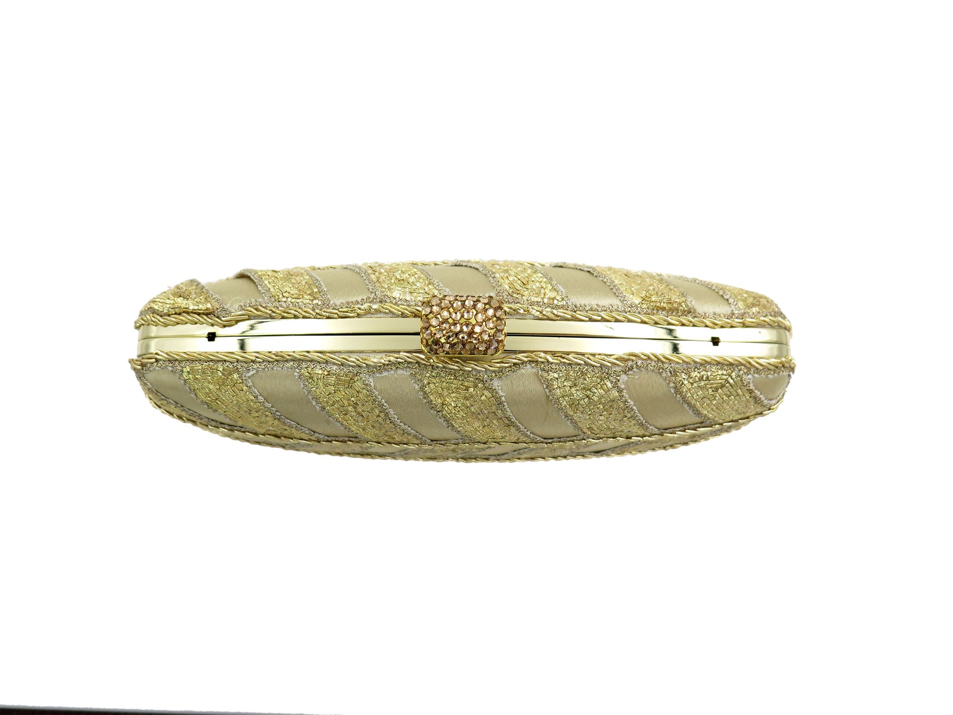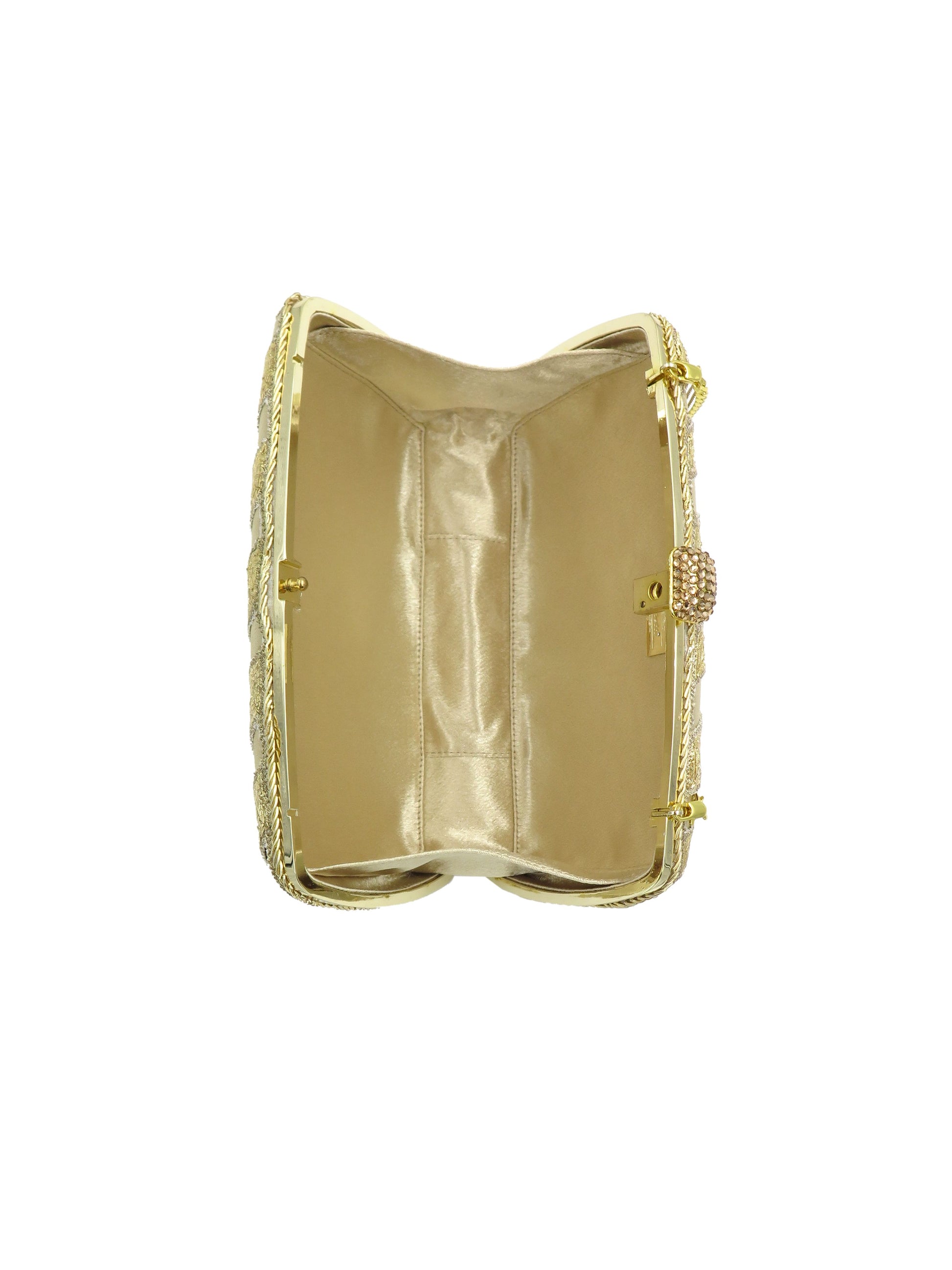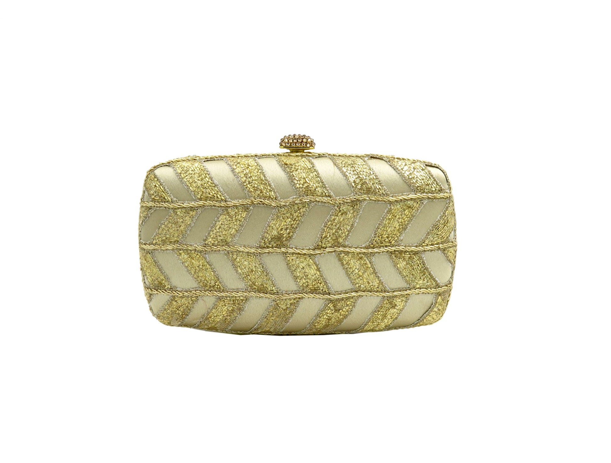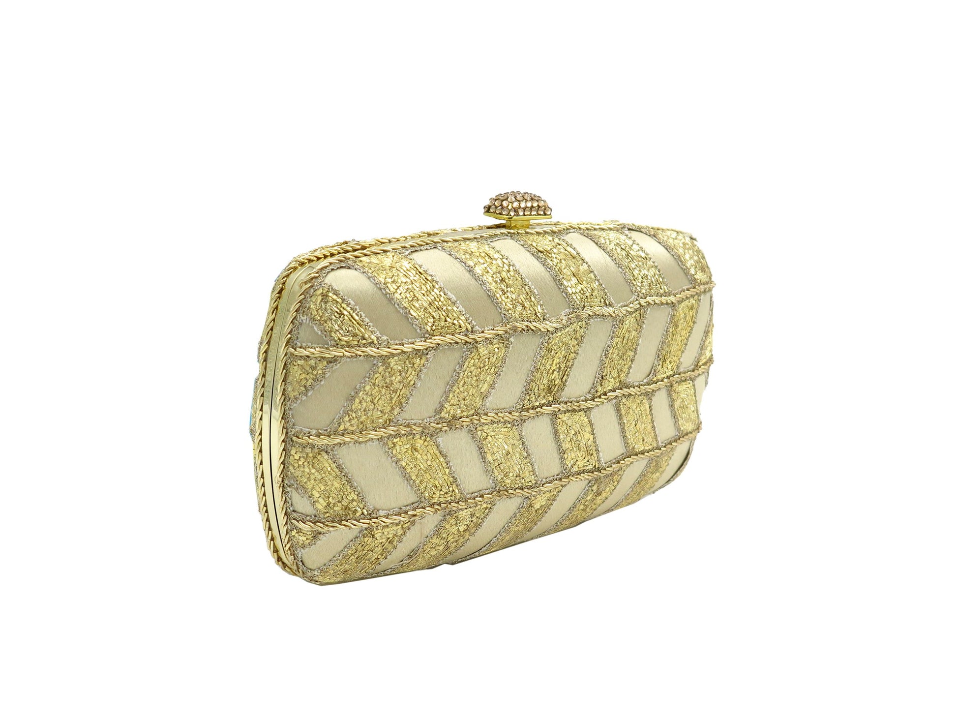 Clutch bags with hand embroidered work formed into delicate tracery.