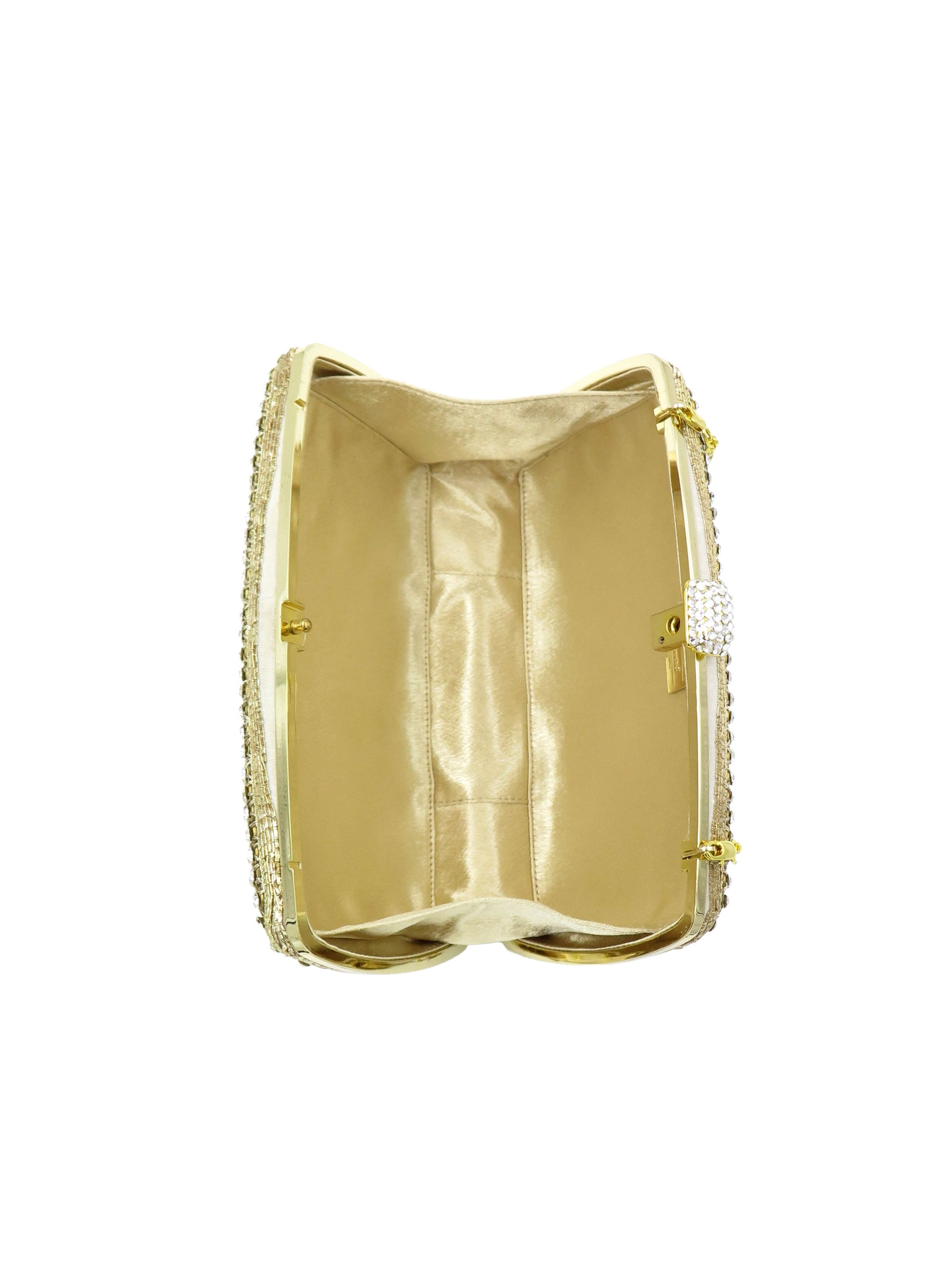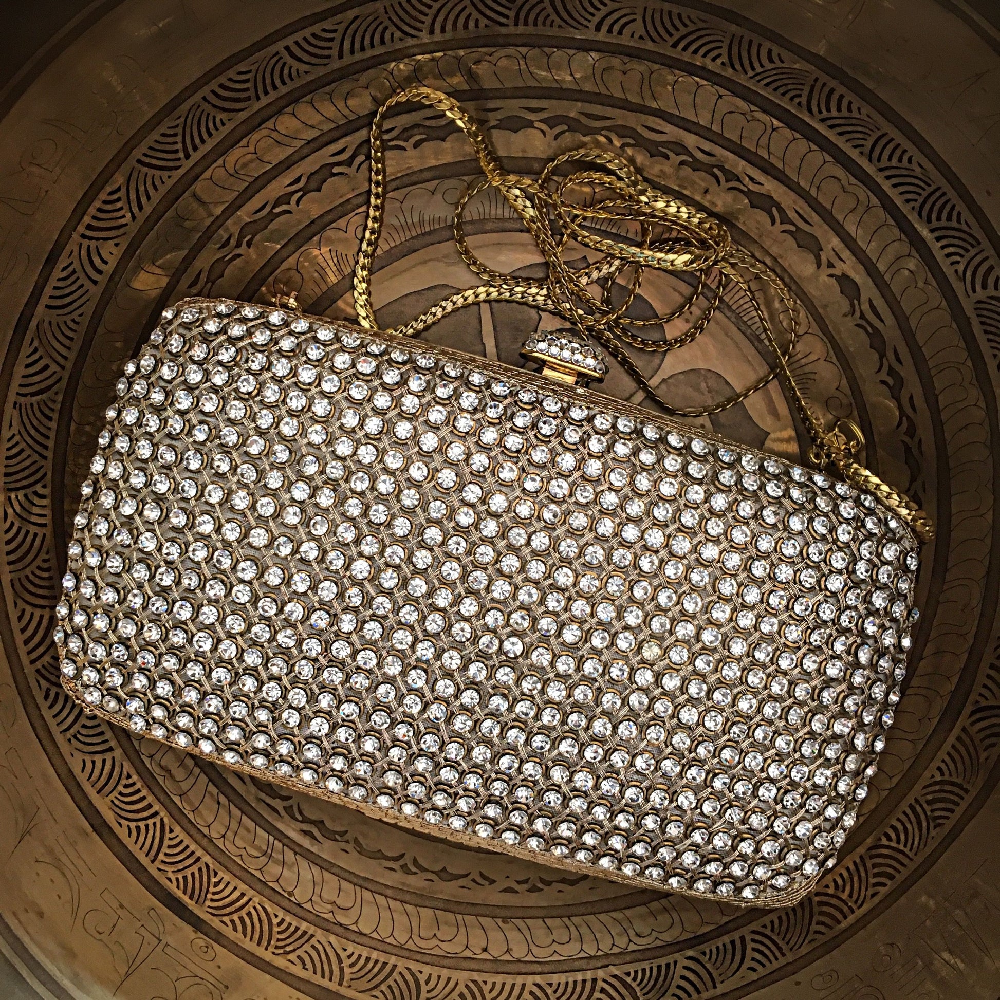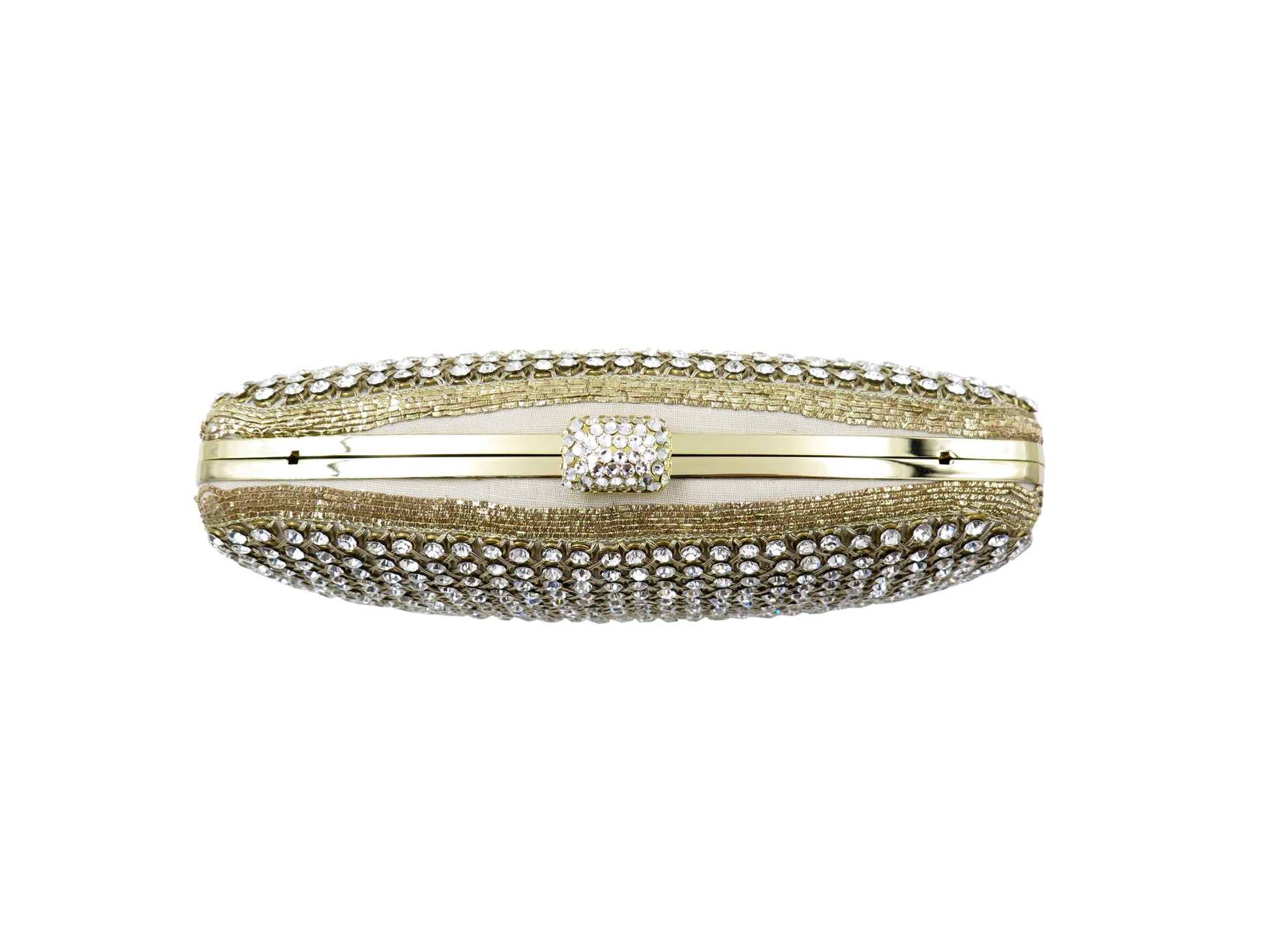 Clutch bags with hand embroidered work formed into delicate tracery.