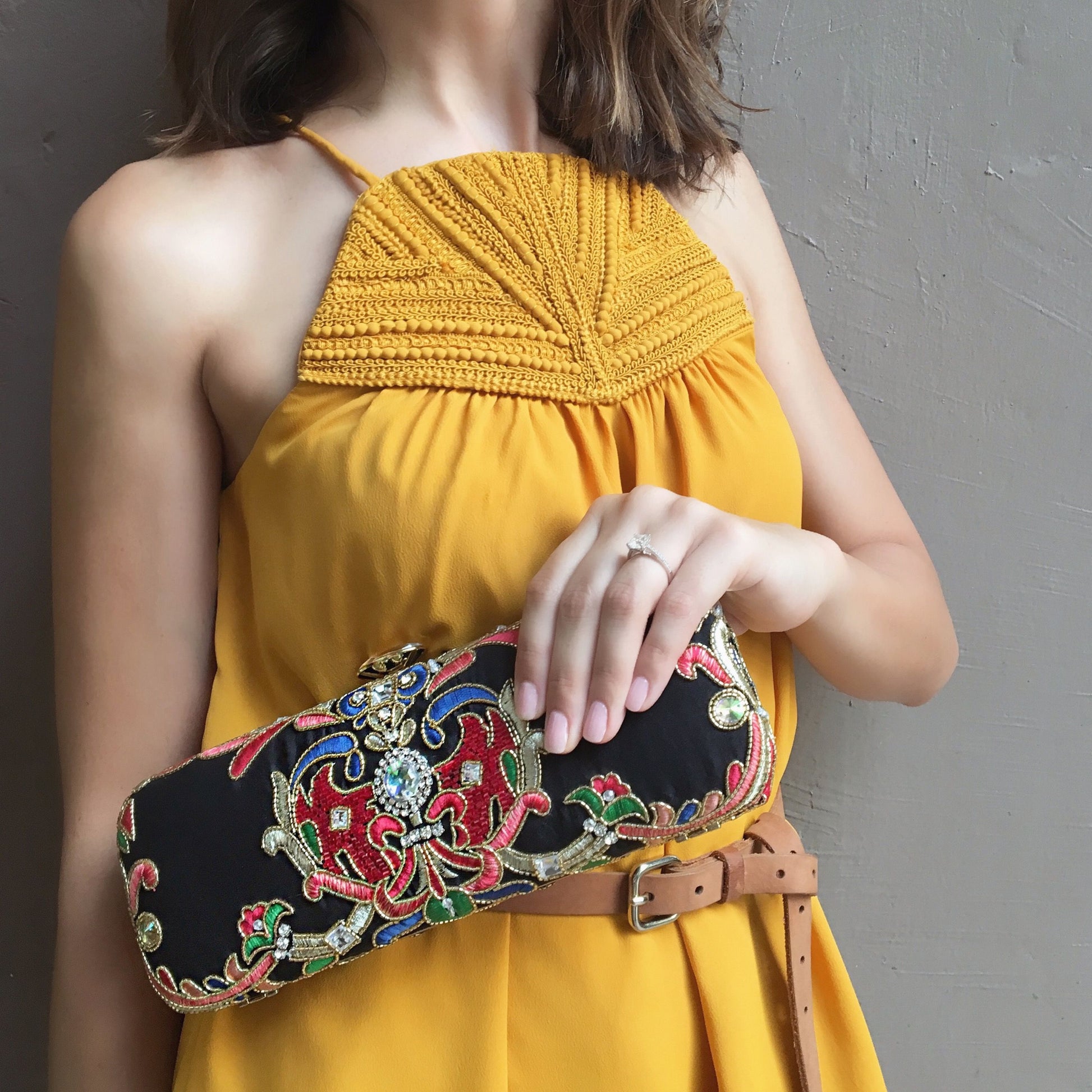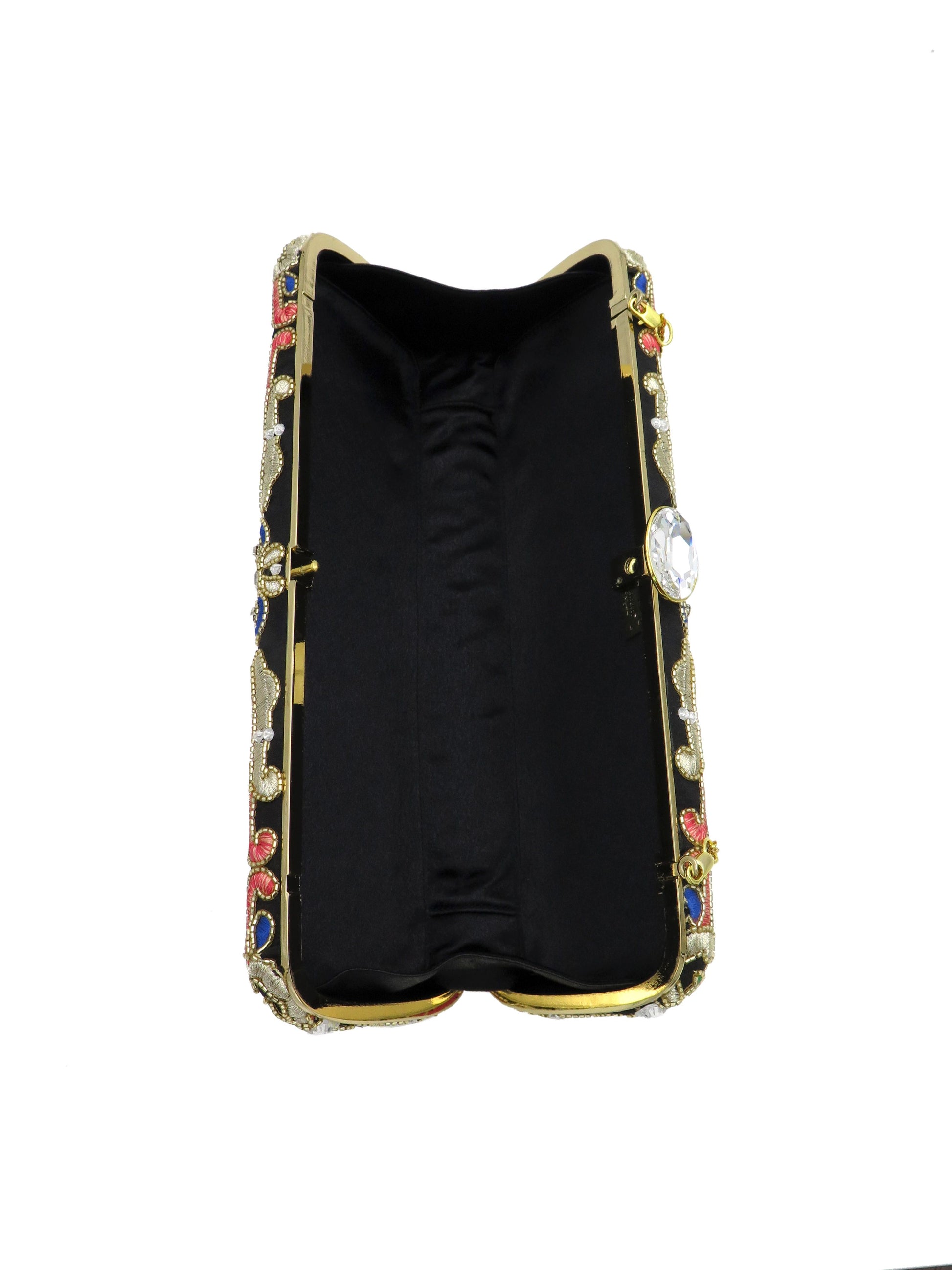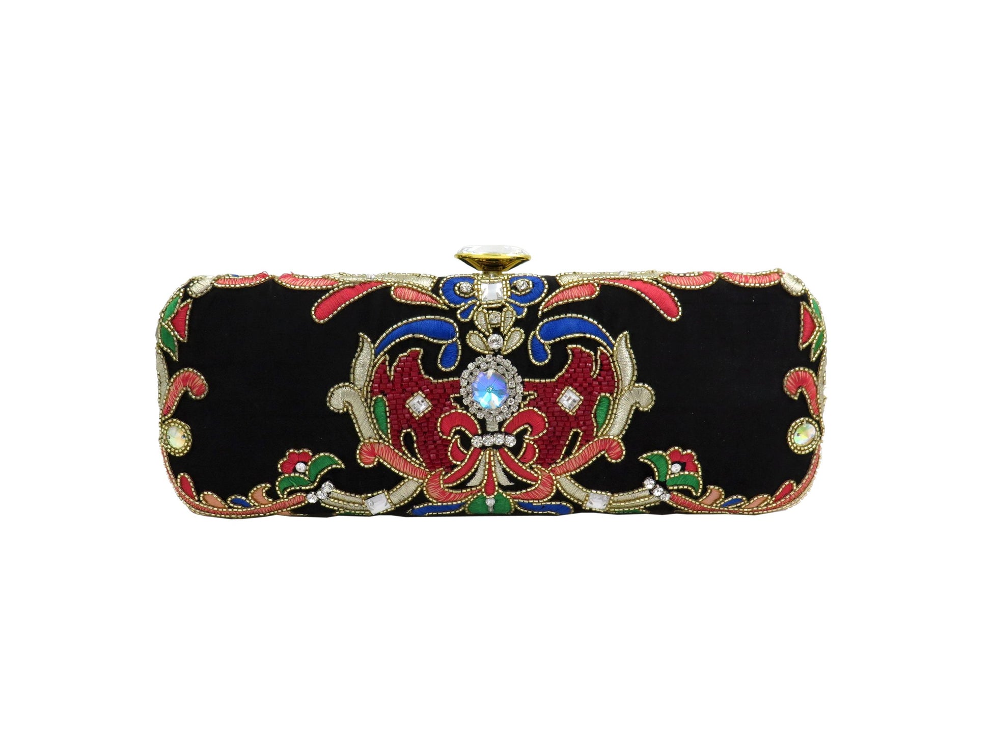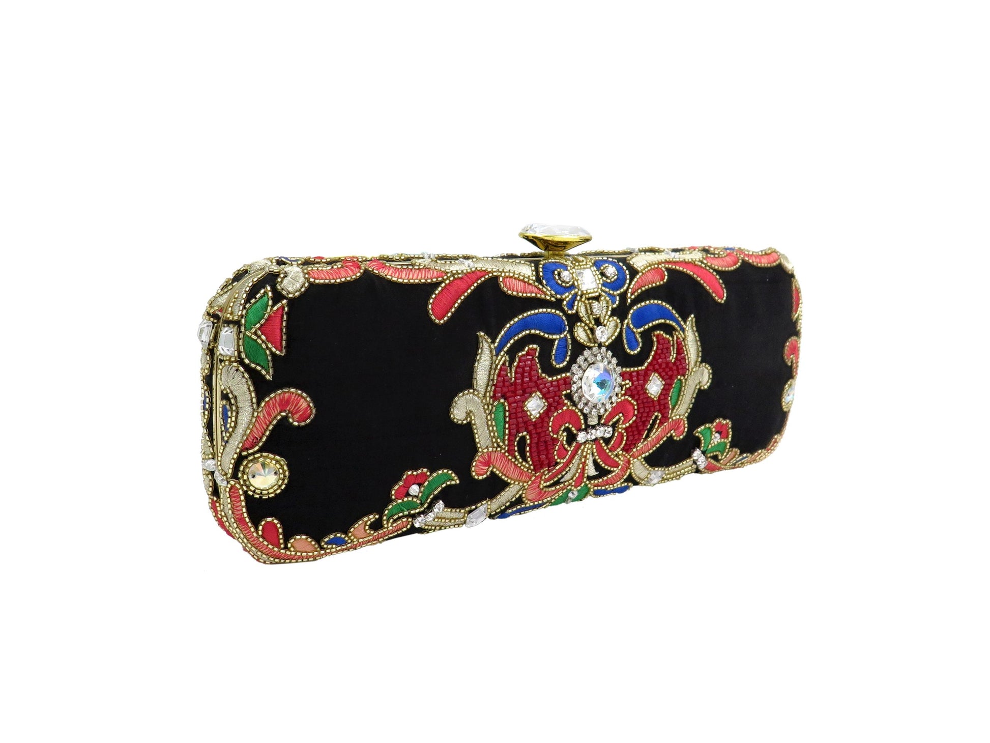 Clutch bags with hand embroidered work formed into delicate tracery.