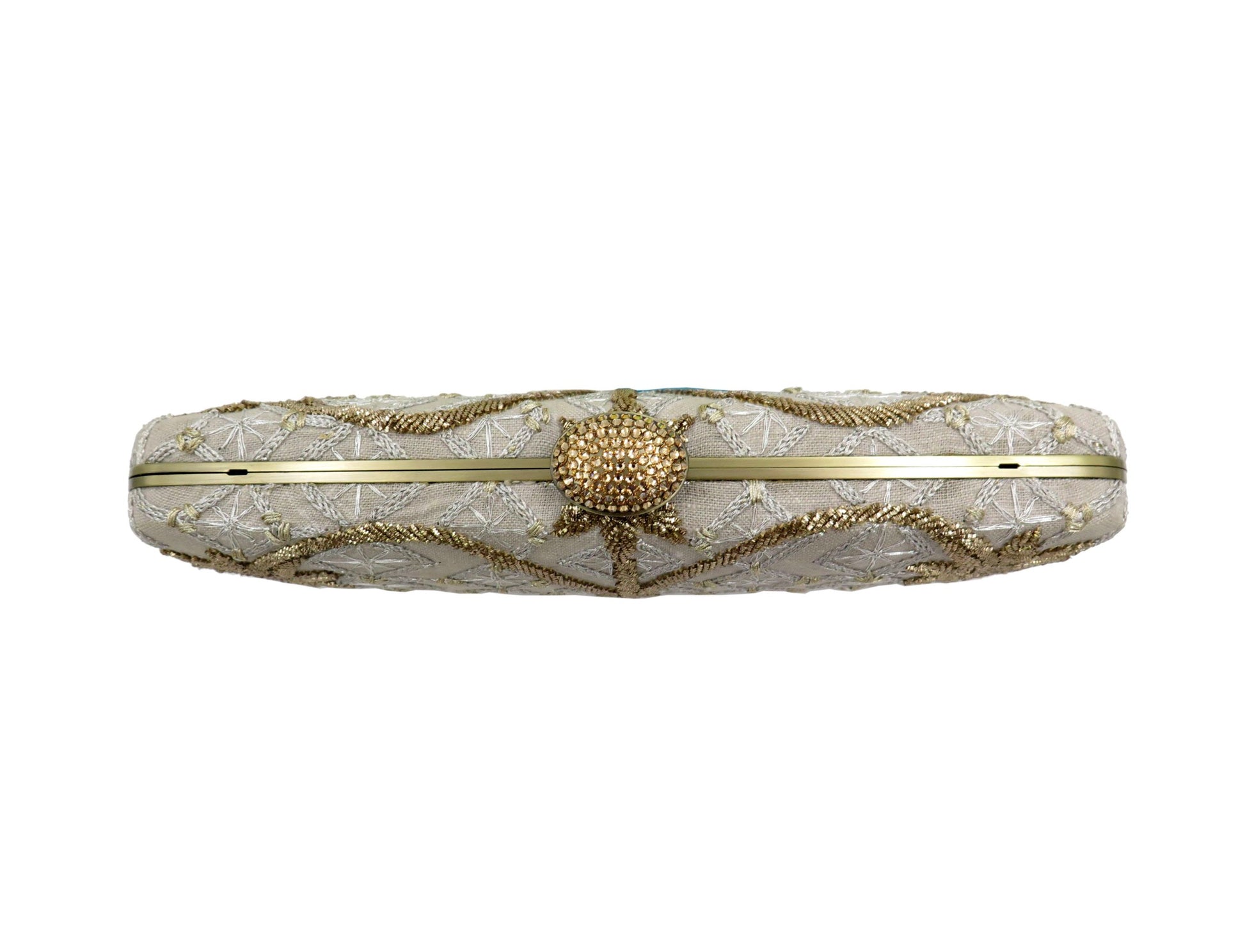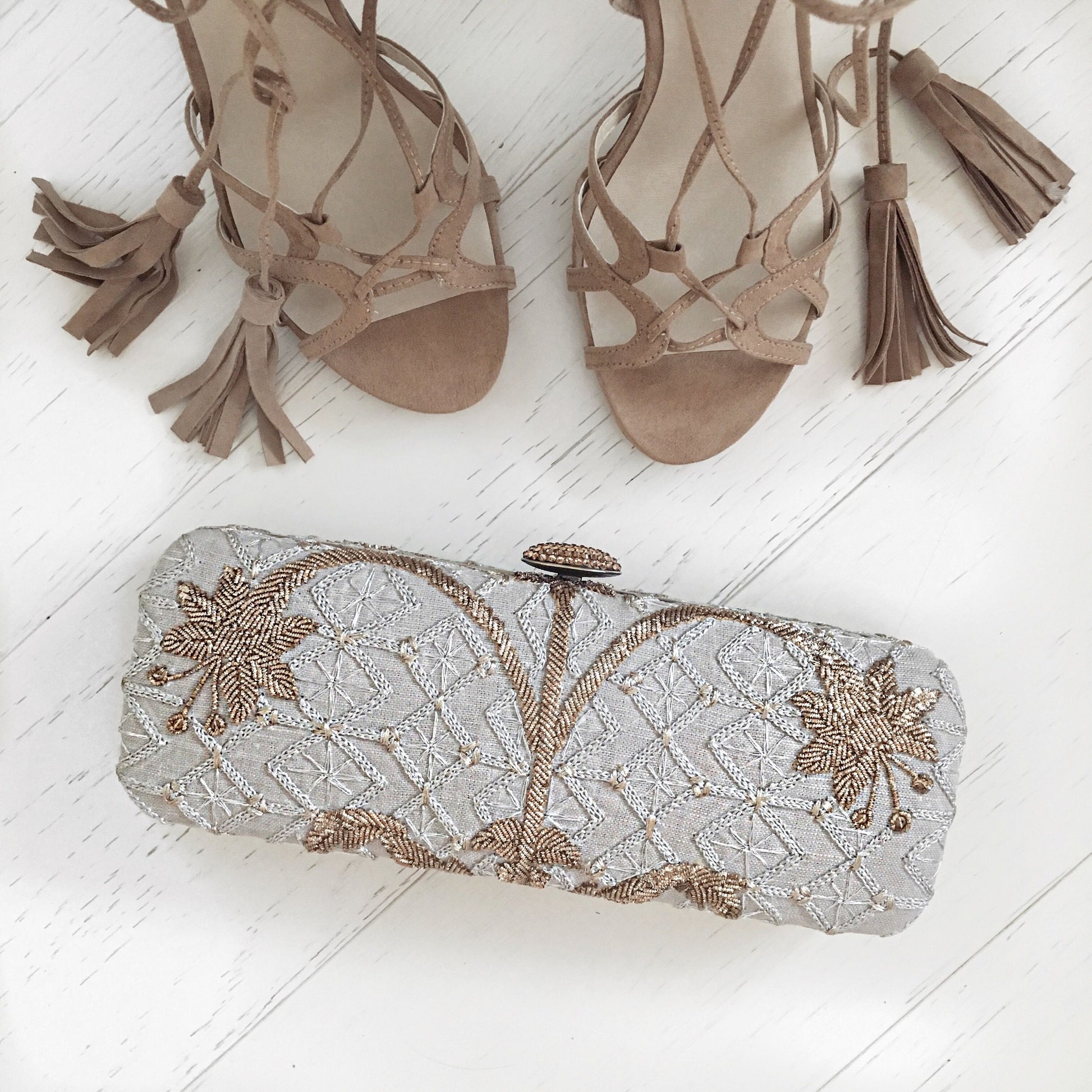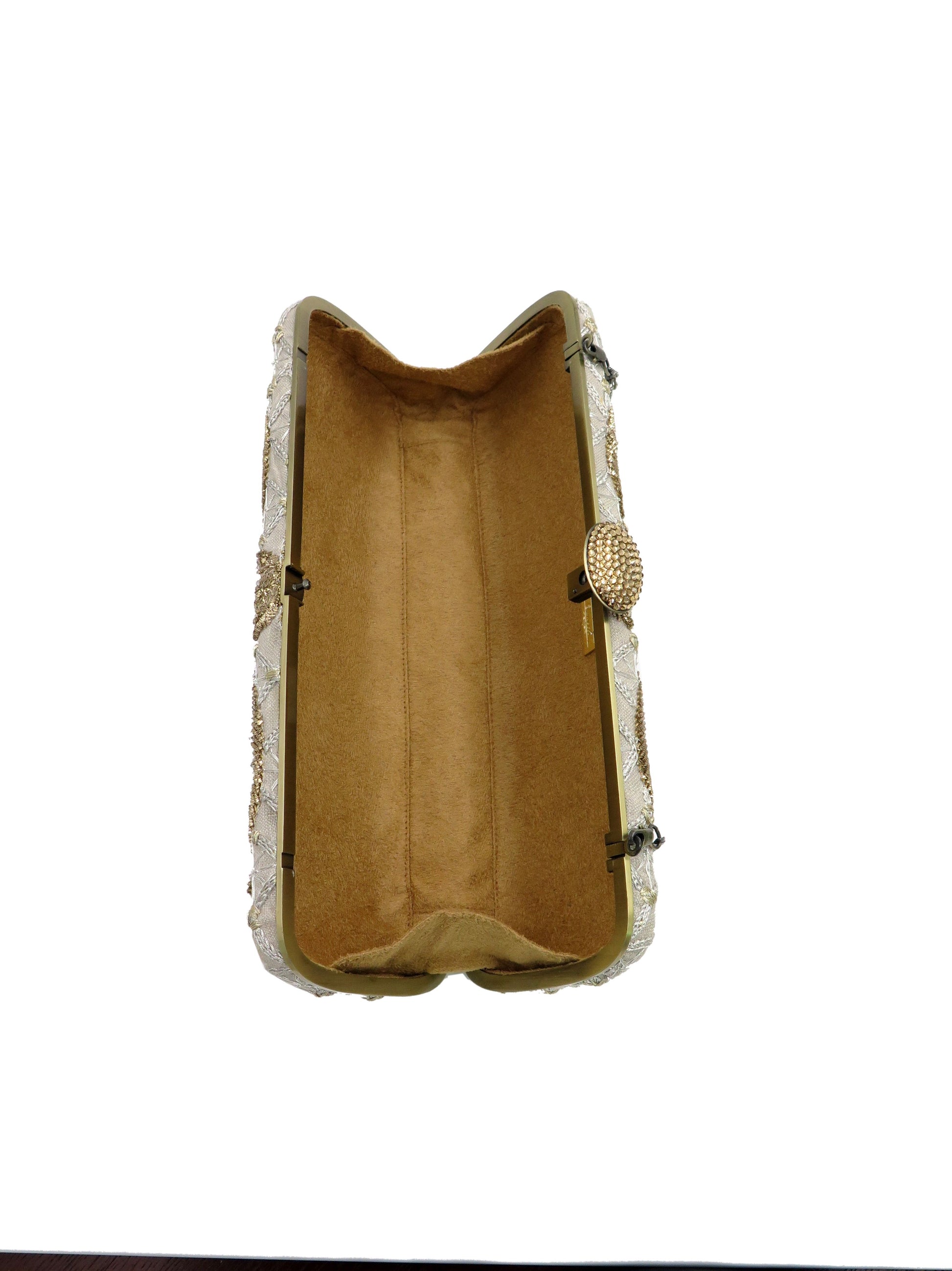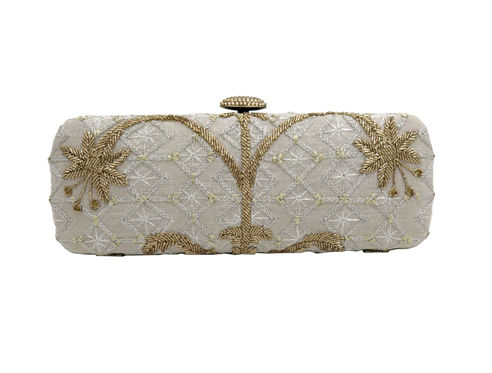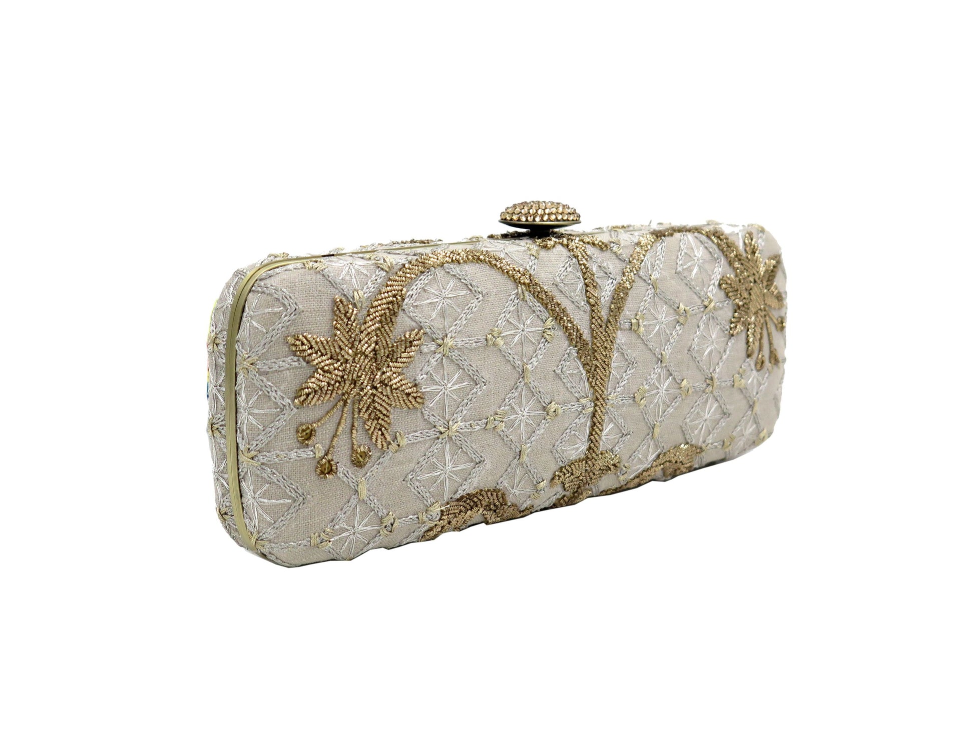 Clutch bags with hand embroidered work formed into delicate tracery.