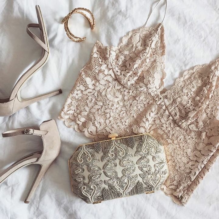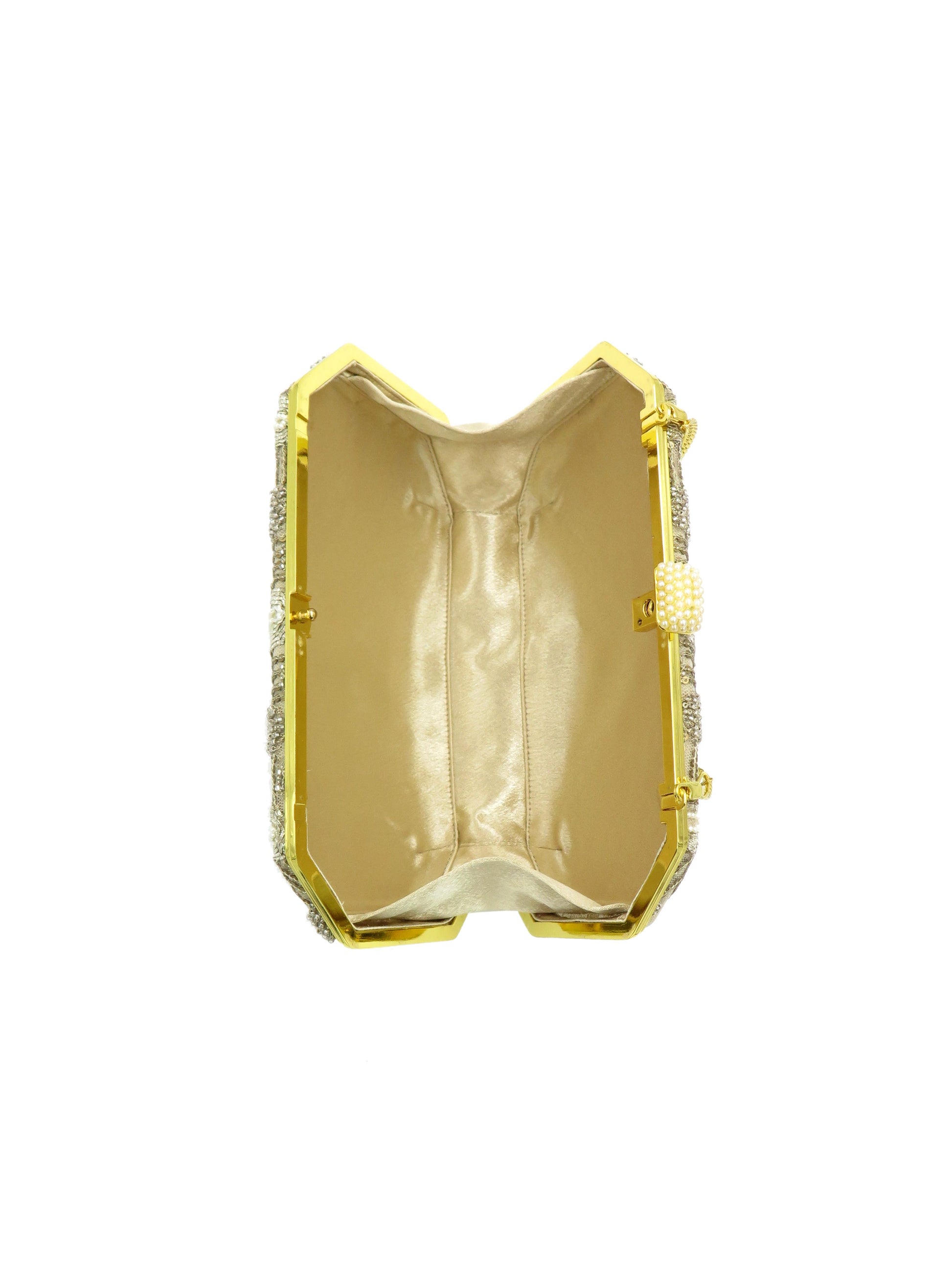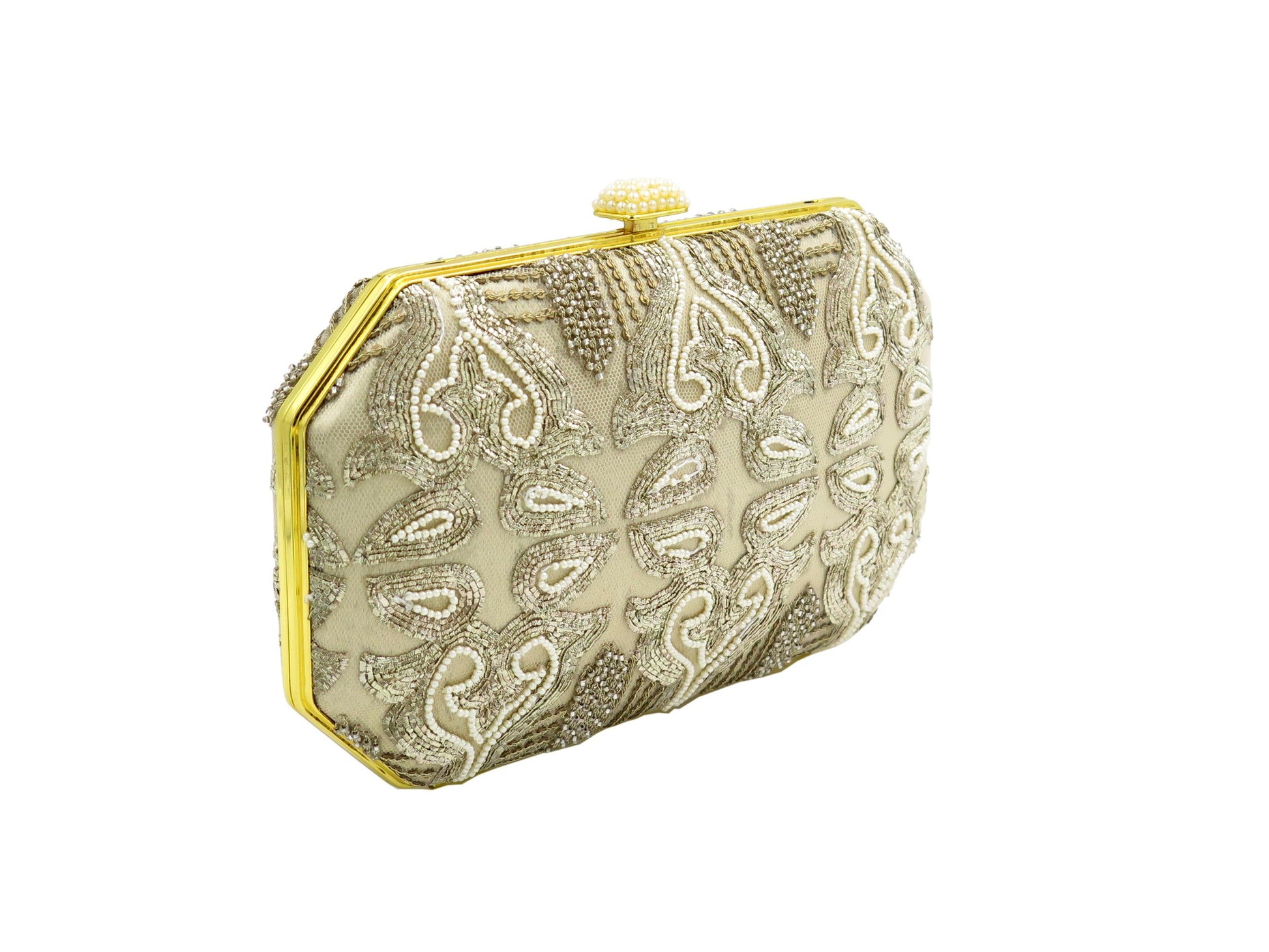 Clutch bags with hand embroidered work formed into delicate tracery.