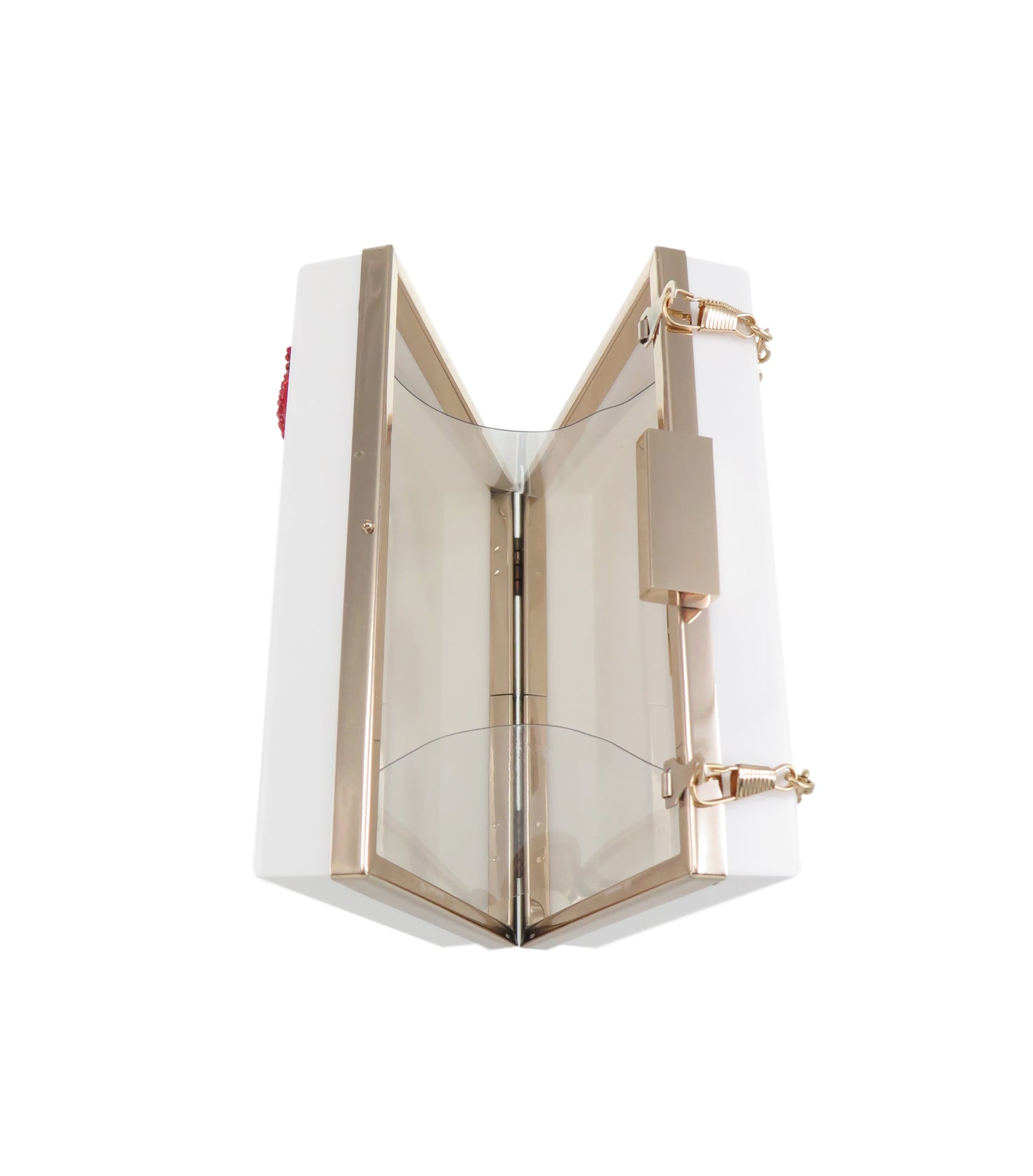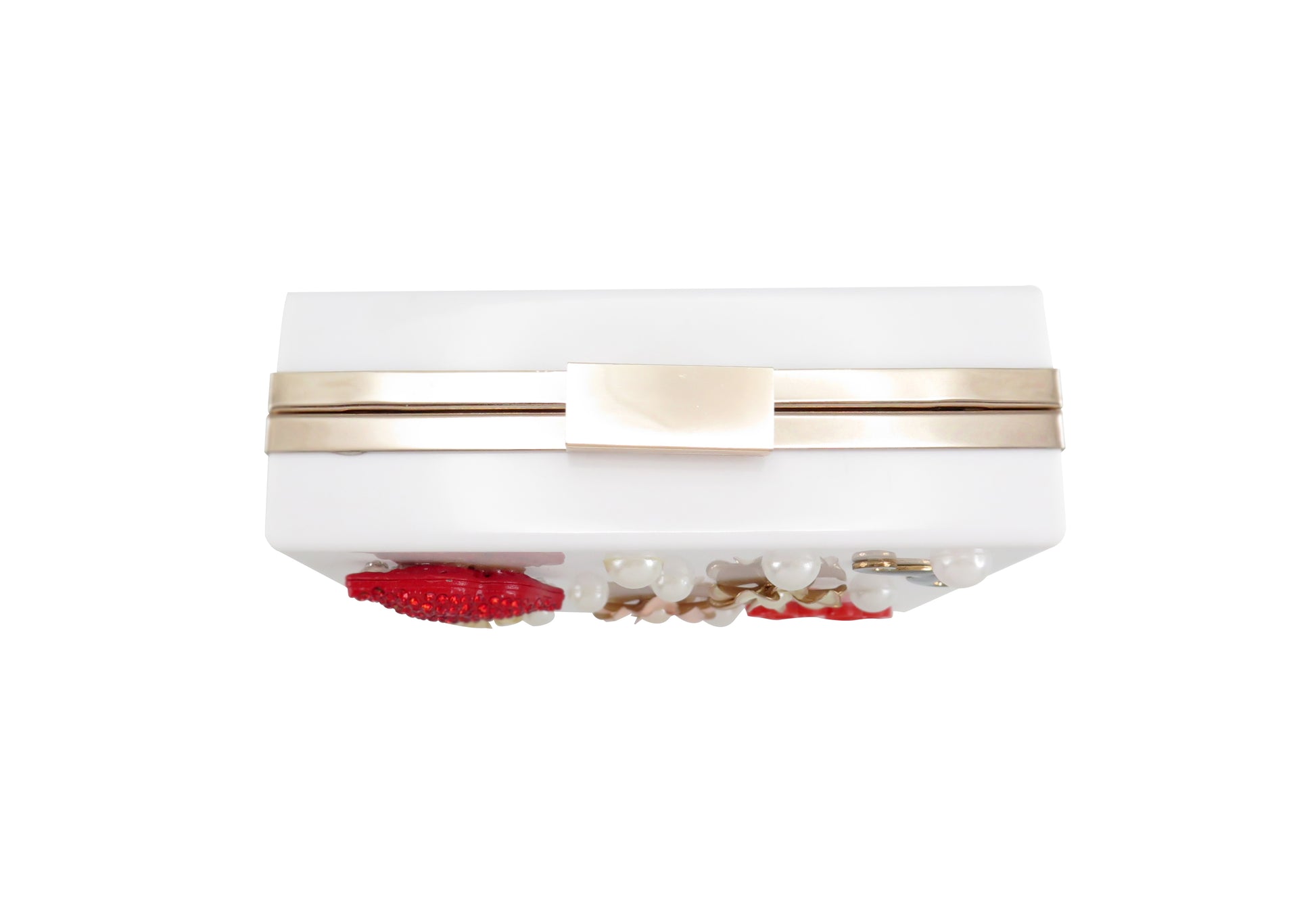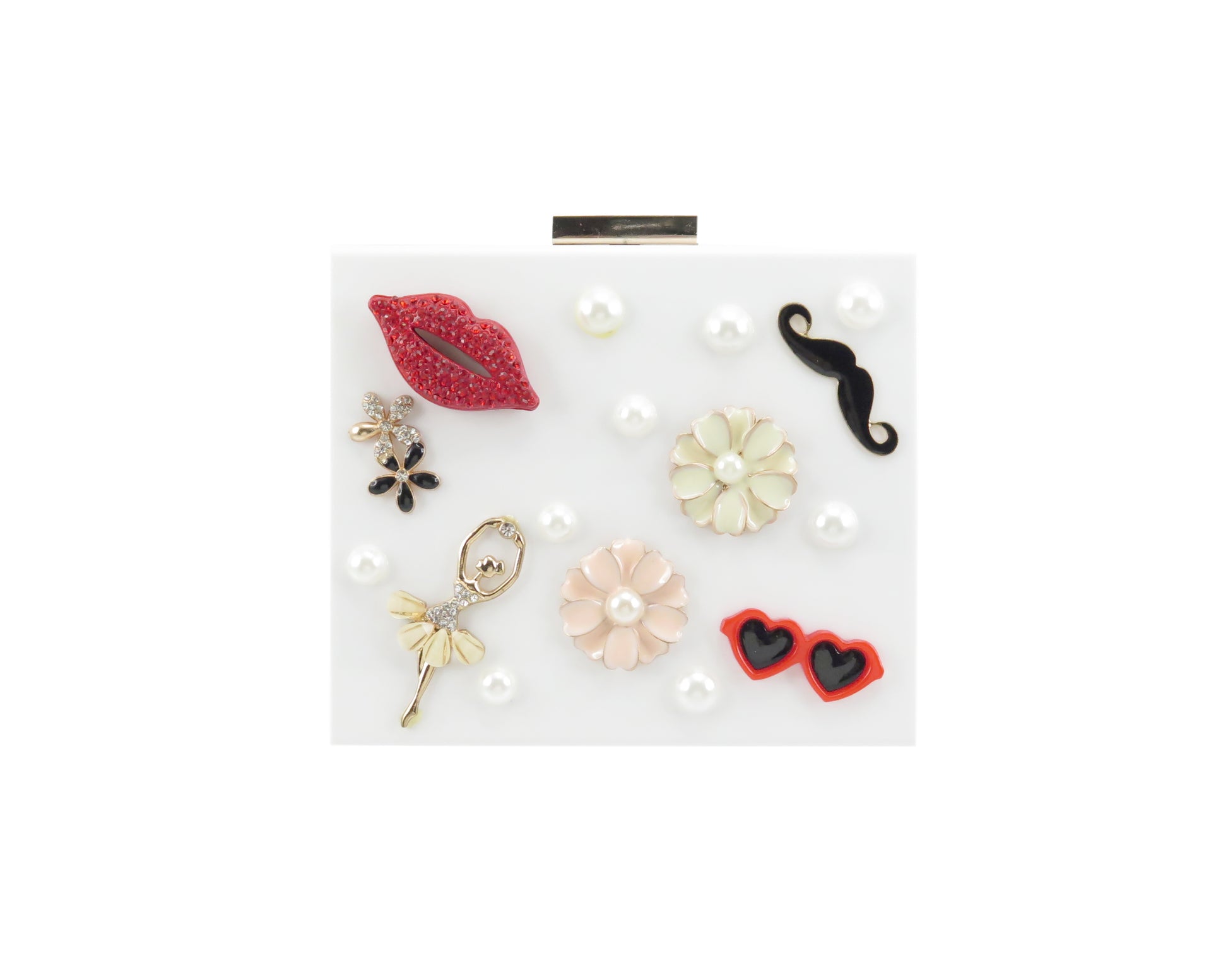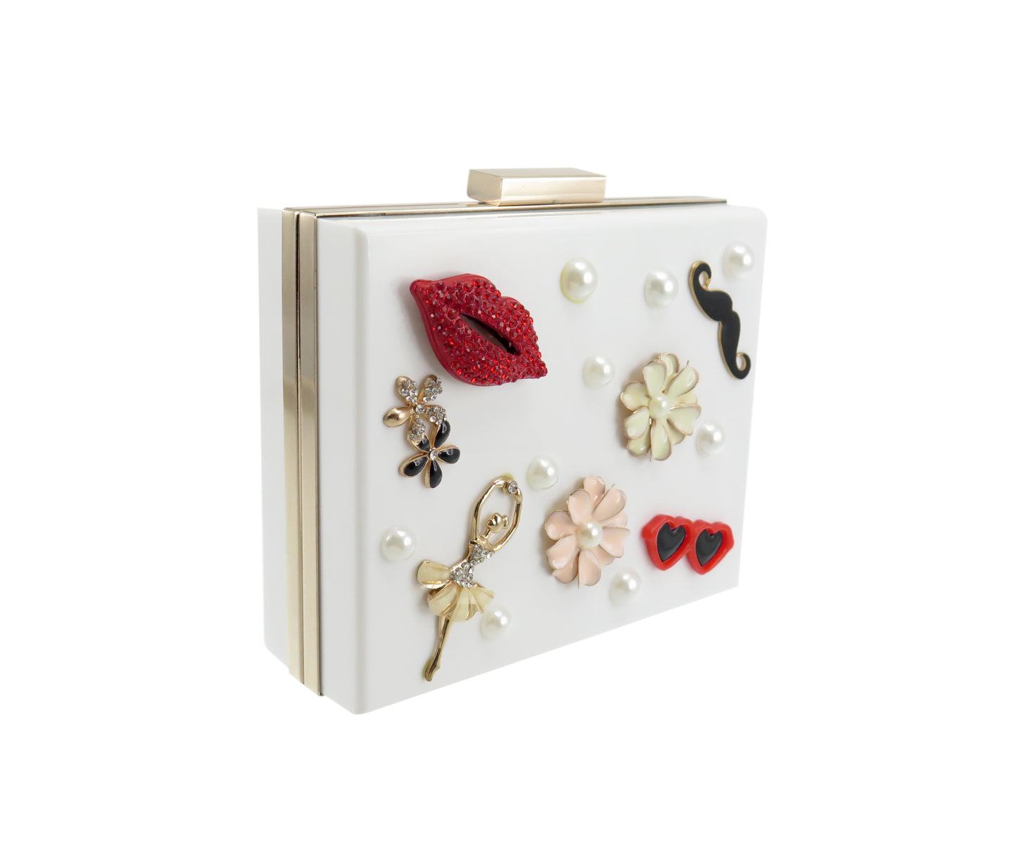 Clutch bags embellished with acrylic and made with the finest synthetic and natural materials. Carry it in the palm of your hand or sling it over your shoulder with the included cross body chain.